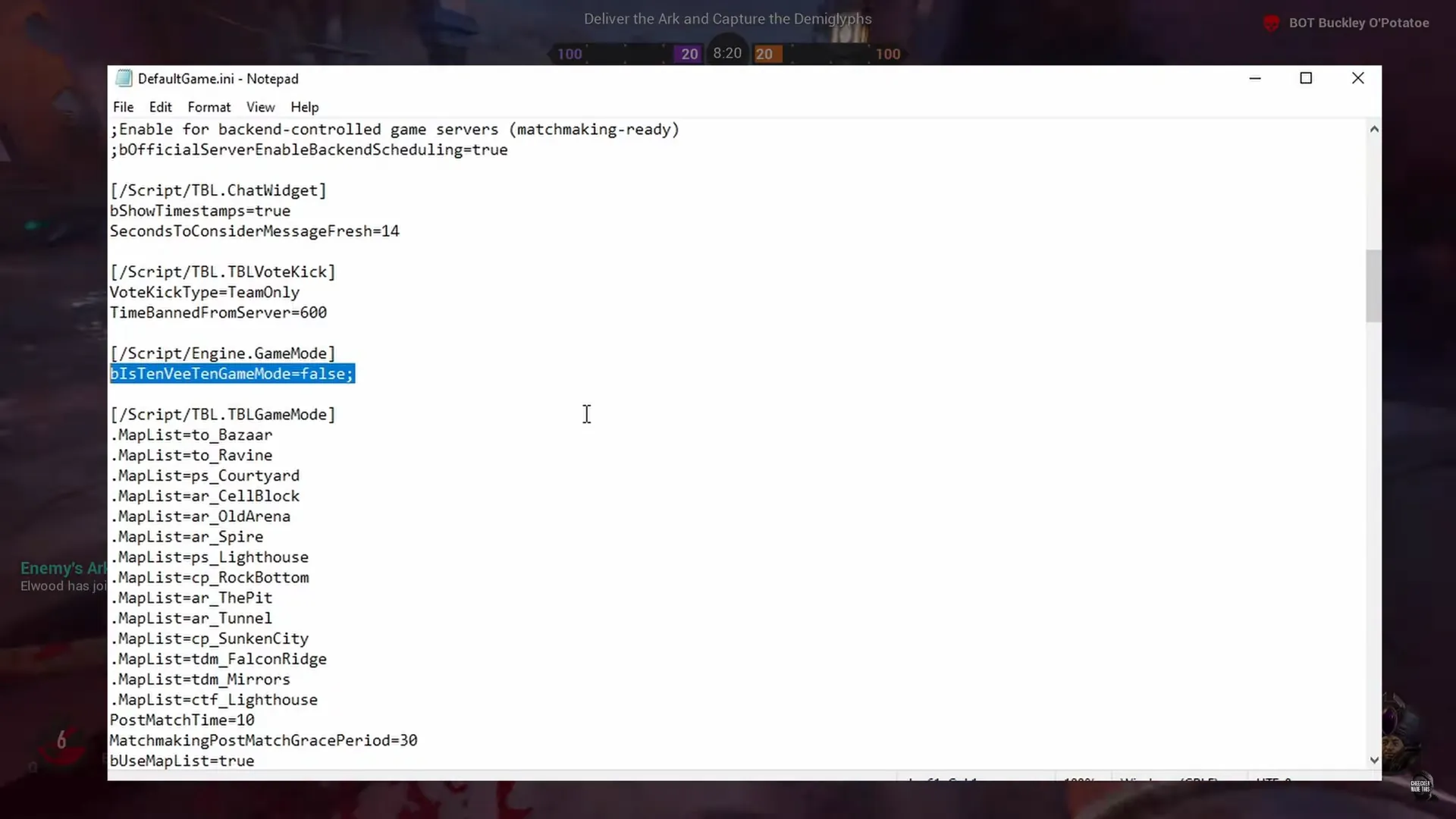 Under [/Script/TBL.TBLGameMode] you can find a laundry list of settings which are all adjustable, like time settings with values representing minutes or seconds, more self explanatory boolean commands and a “.MapList=” command.