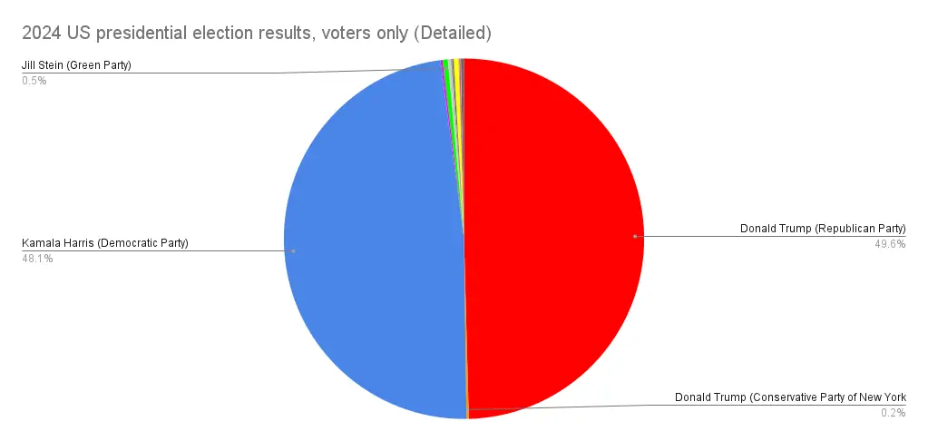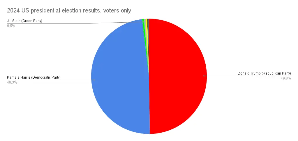 That would never have happened anyway, a bunch of those minor candidate voters, like a lot of those voting for the Libertarians or Kennedy, are right wingers who if you forced them to choose would’ve probably chosen Trump over Harris, but it’s worth emphasising that minor parties aren’t to blame for Kamala’s defeat.