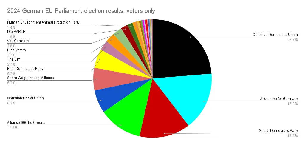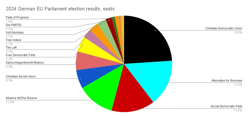 We found out that unlike the German national elections which have their 5% election threshold, where any party getting under 5% of the vote doesn’t get into parliament, in the German elections to the EU Parliament there’s no threshold at all, the German Supreme Court actually abolished it because it violated “the principles of equal voting rights and equal opportunities for the parties”.