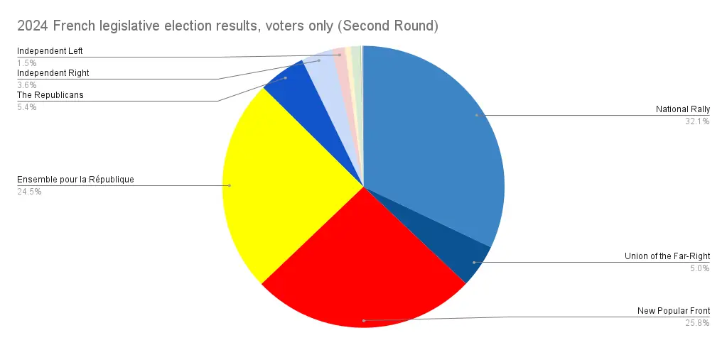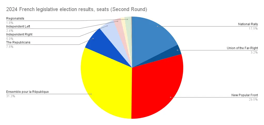 This system can be just as disproportionate as regular FPTP, if not more, and usually you’ll find that the leading parties have their level of representation inflated by 10 or even 20% compared to the votes, something that allows them to form a majority government even if they actually win didn’t the majority of the votes. This time however, it only gave them a boost of 5.5%, and the disproportionality wasn’t enough to benefit anyone, the French parliament is in a nearly even 3 way split between the country’s big political alliances, the far-left New Popular Front, the centrist Ensemble and the far-right National Rally, leaving the country completely paralysed, the last government they tried to form collapsed a few weeks ago.