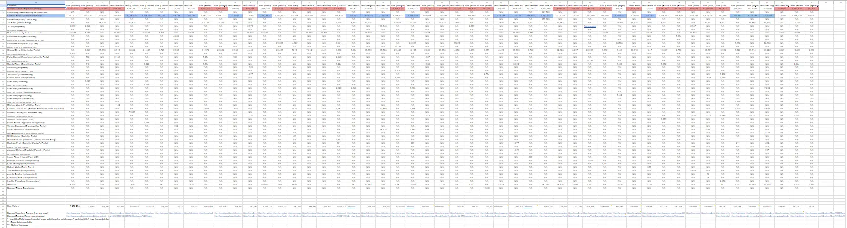 Keep in mind that there’s room for some human error here, I put this list together in around 8 hours and I was very tired by the end of it, I even missed off 2 states (Arkansas and Montana) in my first go around and made a bunch of other mistakes like putting in the wrong numbers when writing down vote totals, giving the votes to the wrong candidate, missing candidates entirely, I caught all of these straight away except for the missing states and I’m relatively sure I got everything right in the end but just saying, this was put together by one guy when it’s the kind of work a whole team should probably have been doing.