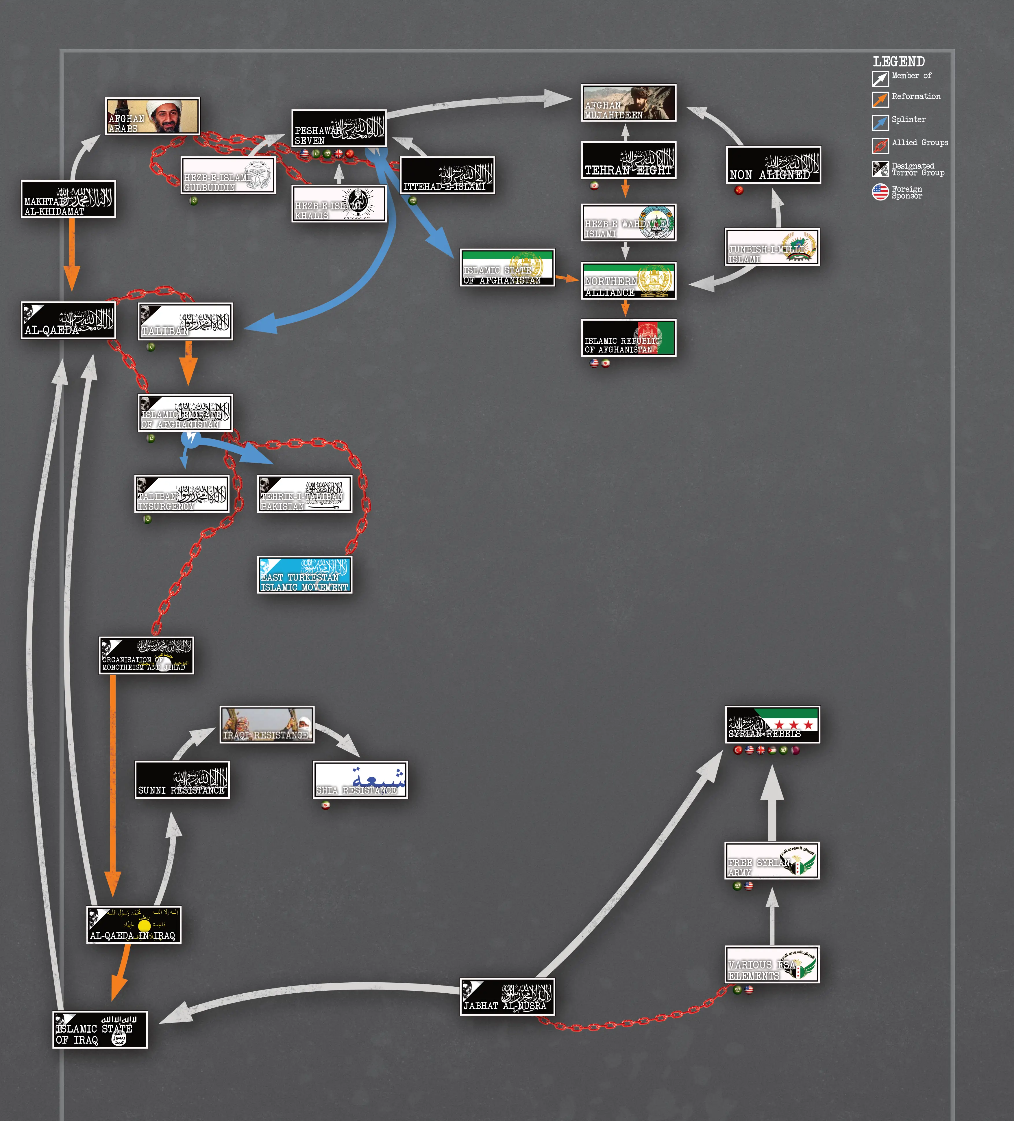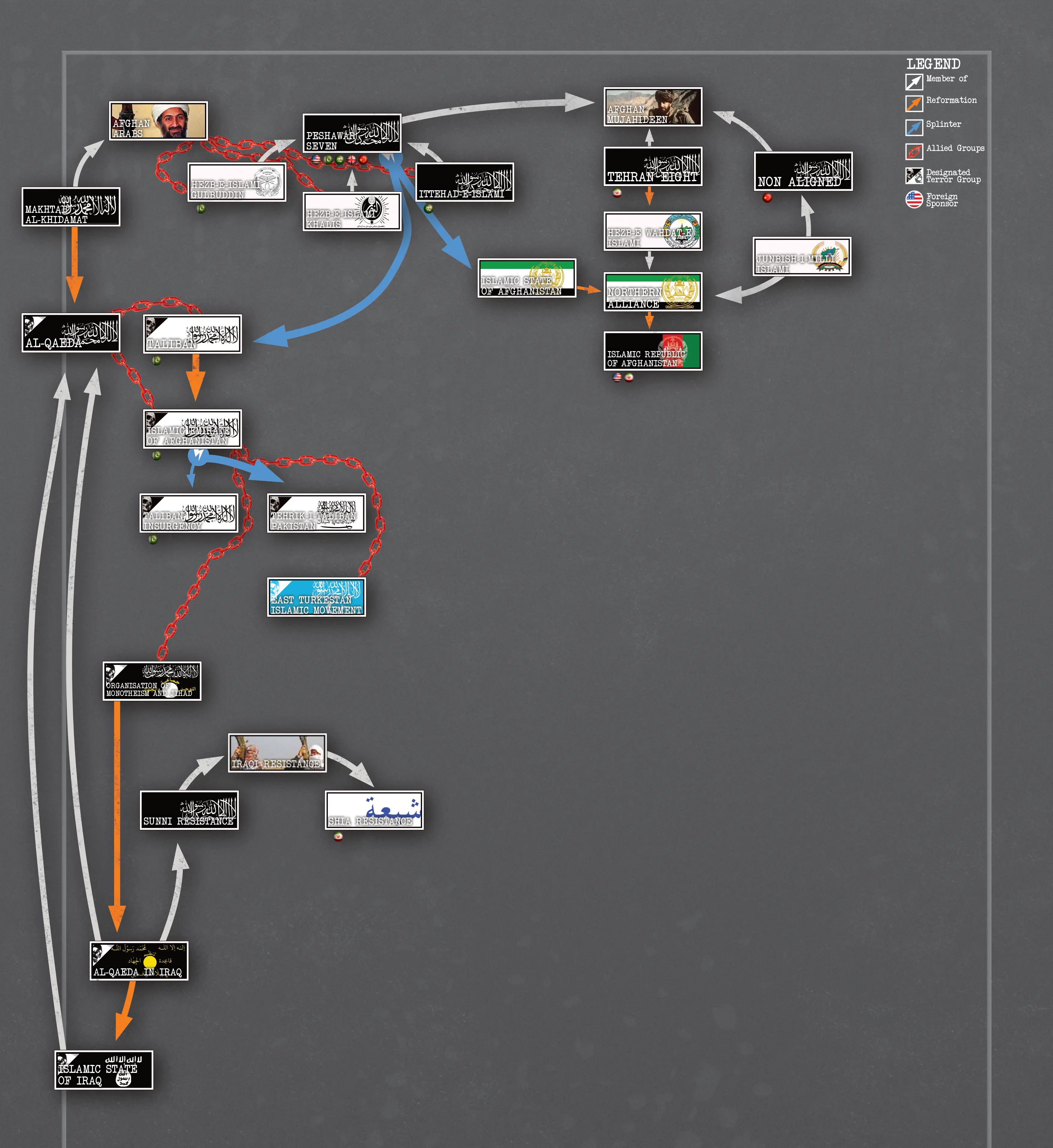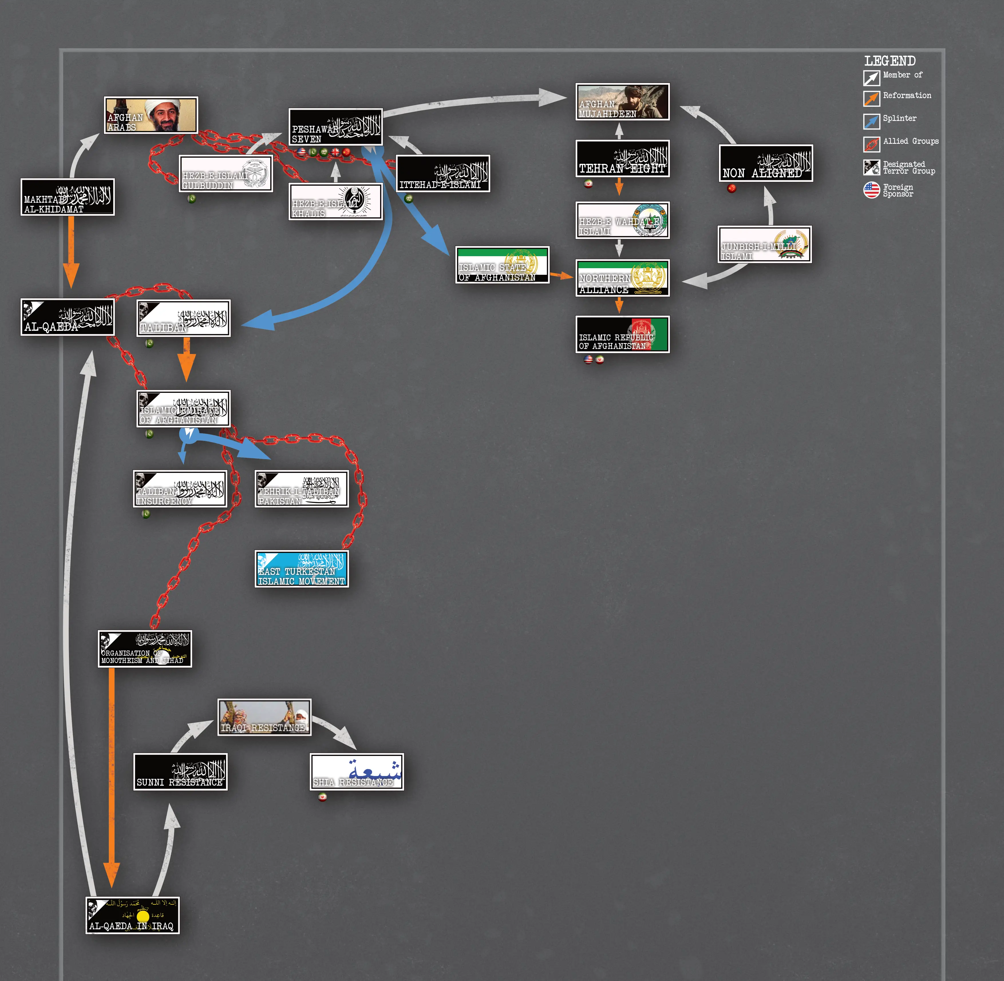 In fact, the only Al-Qaeda affiliate that had set foot in Iraq before the invasion was the “Organisation of Monotheism and Jihad”, here we can find it on our Terror Family Tree, it was one of the groups which had emerged in the Afghan Civil War, this group had fled Afghanistan after the US invasion in 2001, and chose a small lawless corner of Iraq as their hiding place.