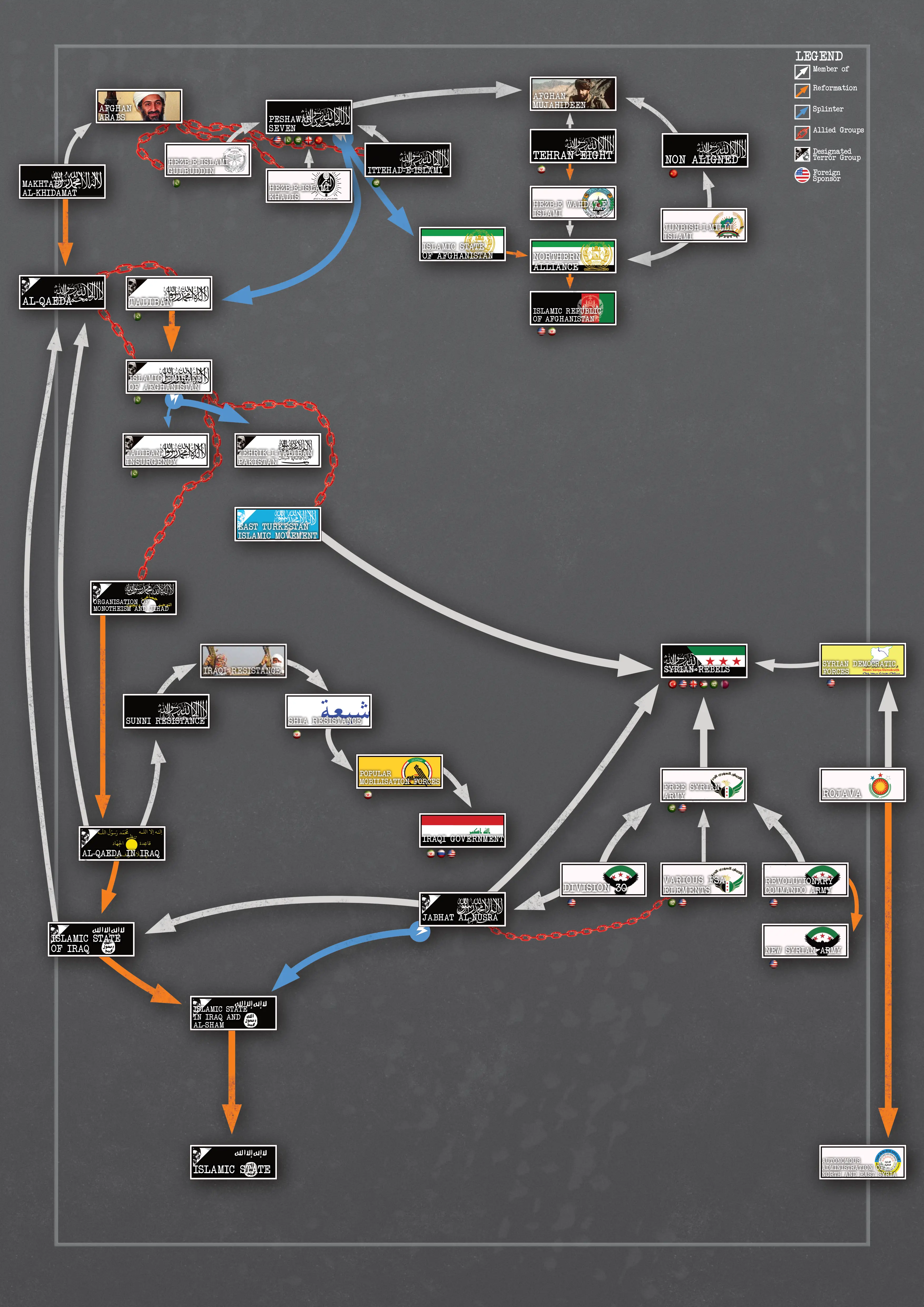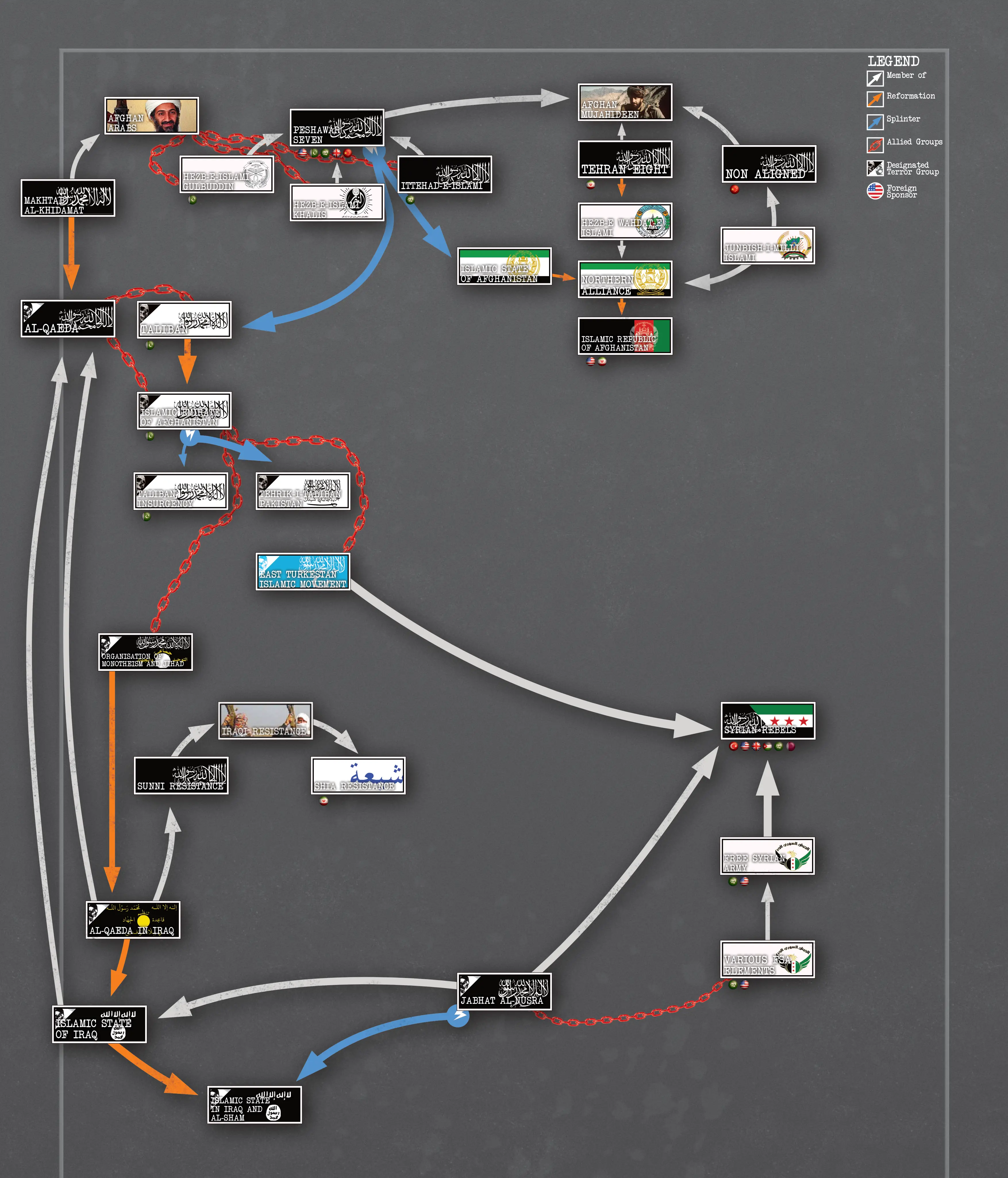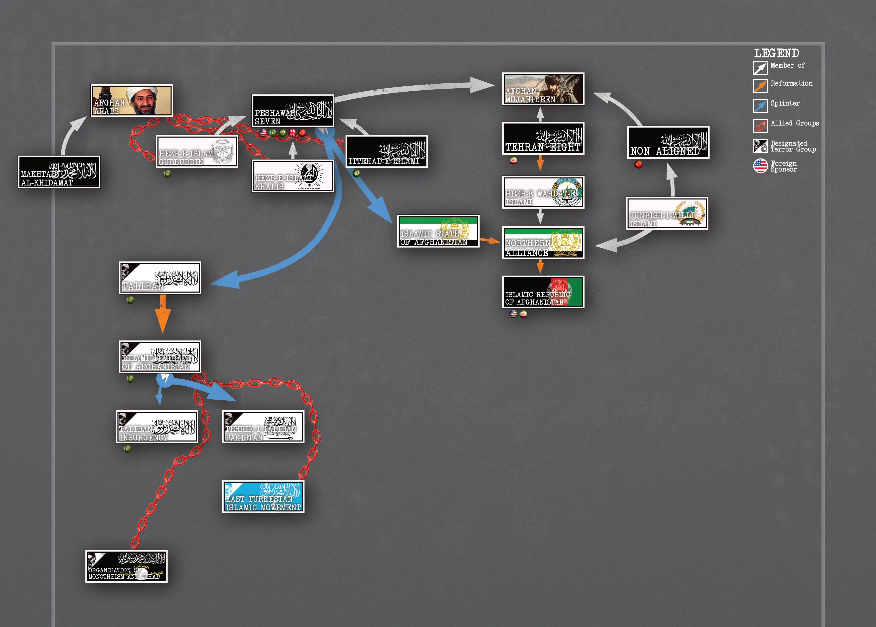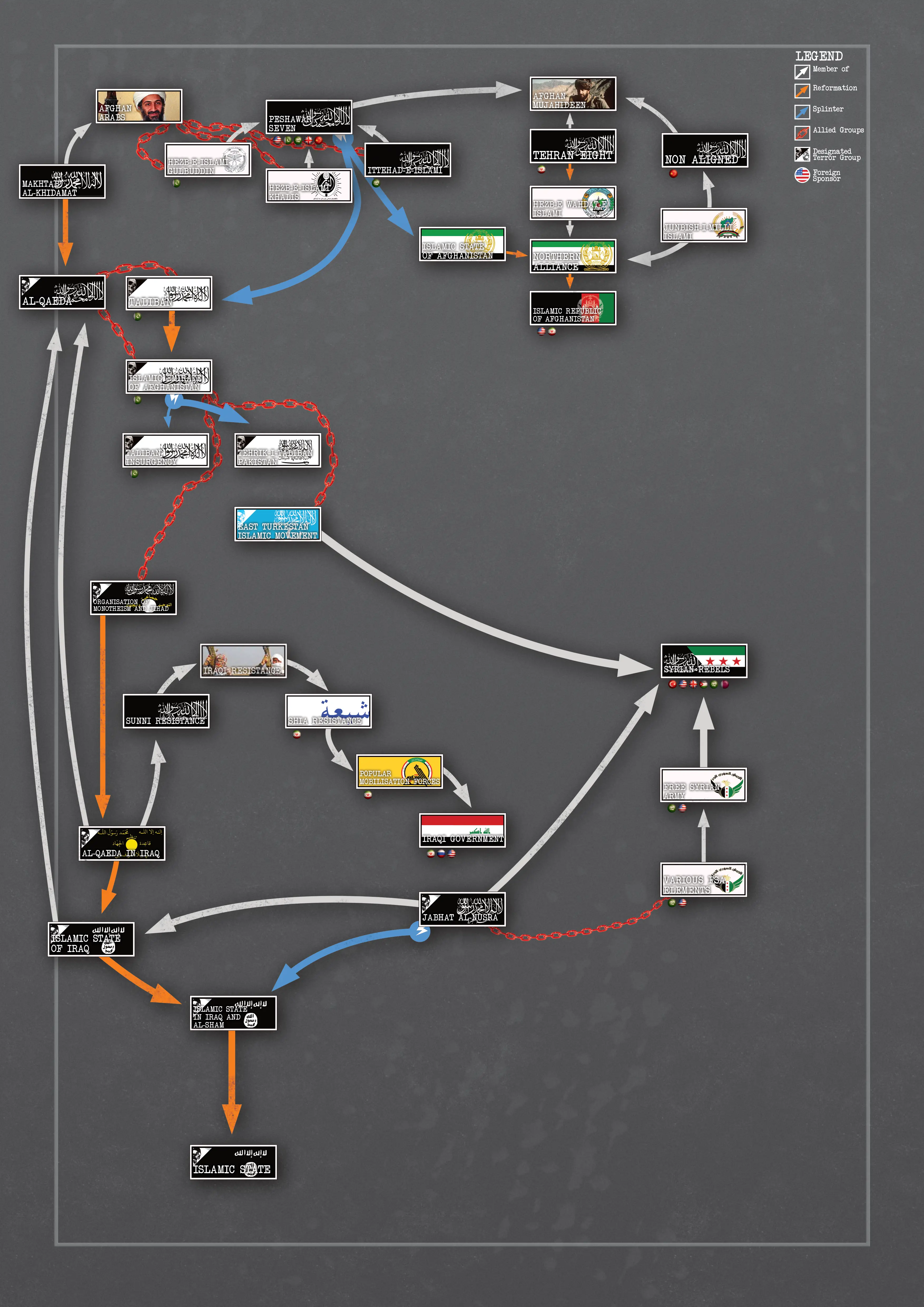 In fact, the only Al-Qaeda affiliate that had set foot in Iraq before the invasion was the “Organisation of Monotheism and Jihad”, here we can find it on our Terror Family Tree, it was one of the groups which had emerged in the Afghan Civil War, this group had fled Afghanistan after the US invasion in 2001, and chose a small lawless corner of Iraq as their hiding place.