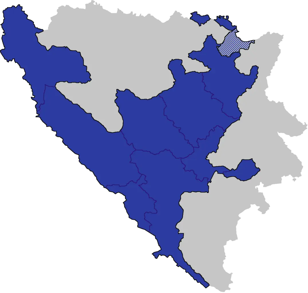 Bosnian Key: Blue - Federation of Bosnia and Herzegovina Grey - Republika Srpska Mixed Blue/Grey - Brčko District