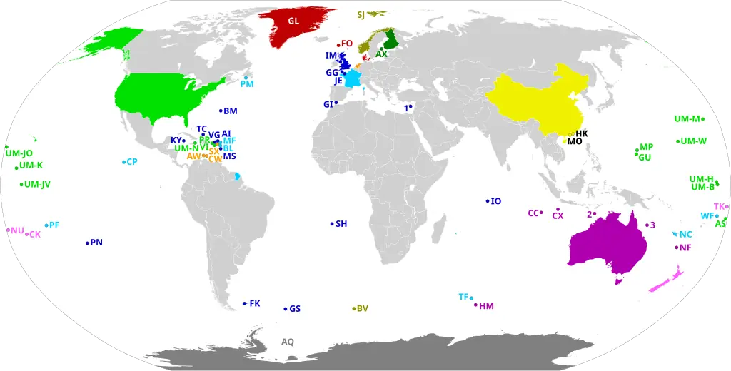 “Dependent territories and their sovereign states. All territories are labeled according to ISO 3166-1 or with numbers. Coloured areas without labels are integral parts of their respective countries."