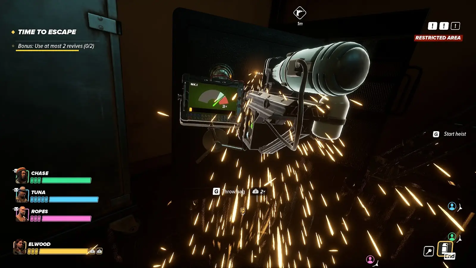 The fact that the weapons and equipment cost more than the heisters that carry them just discouraged me from using the custom boss for much of the runtime and the low payouts made everything feel like a drag when it came to the progression system; This wasn’t a deal breaker for me (until the final stretch of my journey to max level, at least) because the overall gameplay loop is just really fun, but the incredibly slow money grind meant that it took far longer to unlock new weapons, heisters and equipment, something that’s needed to keep the gameplay fresh, than it should’ve done.