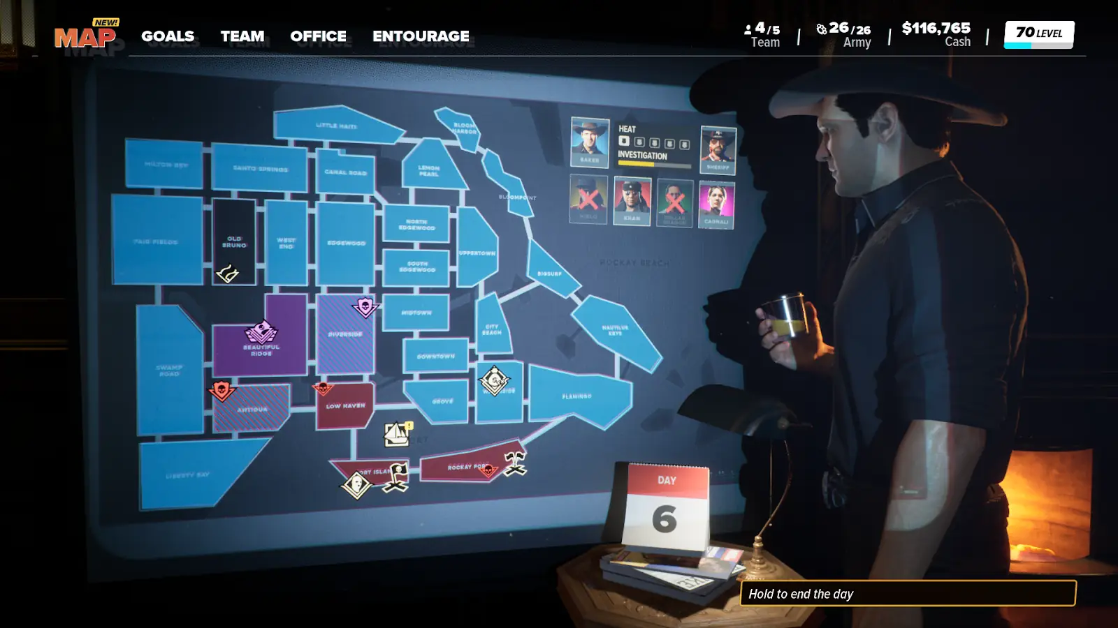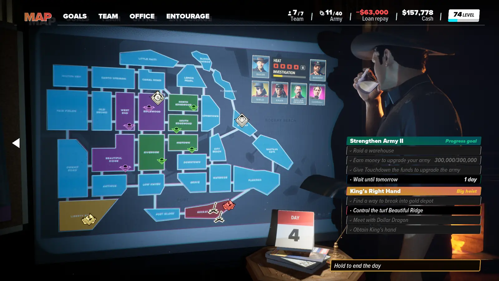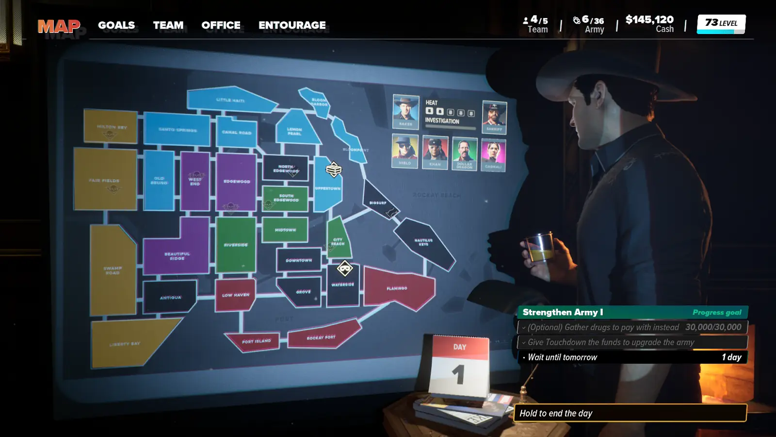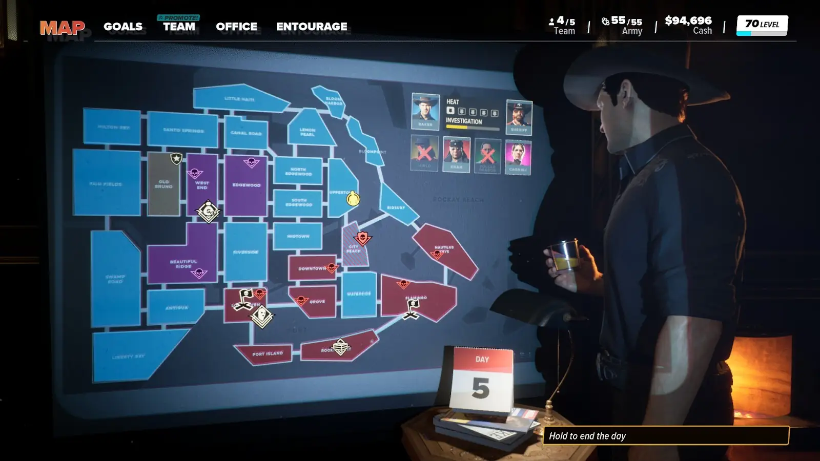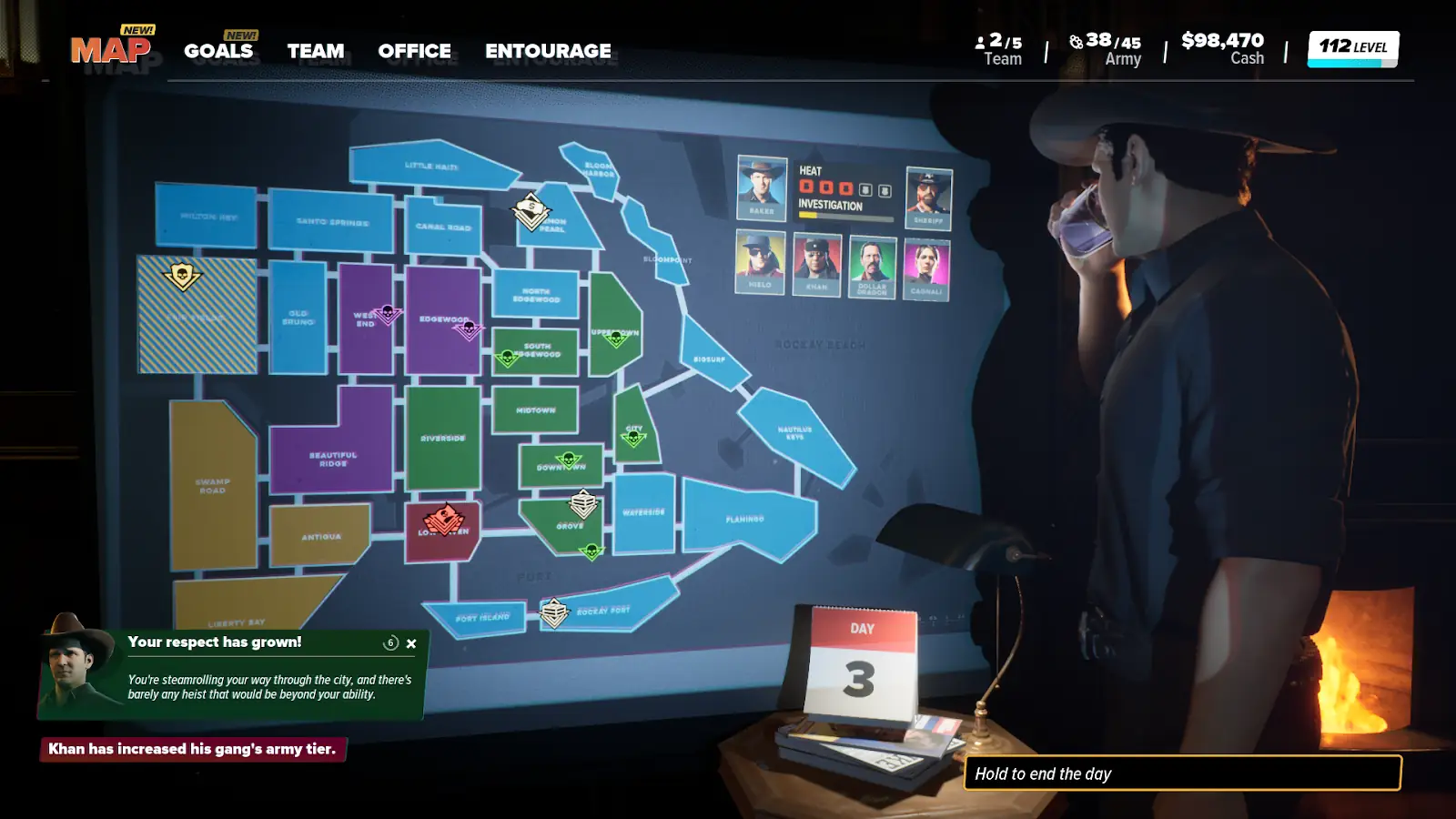 With several upgrades that slowed the investigation under my belt, reducing the police’s speed by 20%, the investigation became irrelevant as well, rarely even reaching half way before I claimed victory even though I was spending every day rampaging across town in the turf war, usually ending each day with max heat.