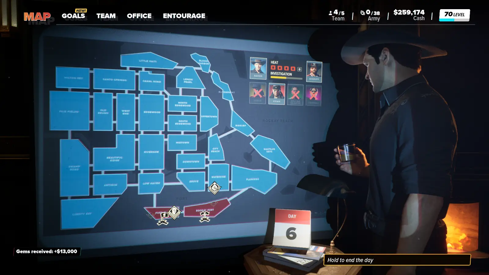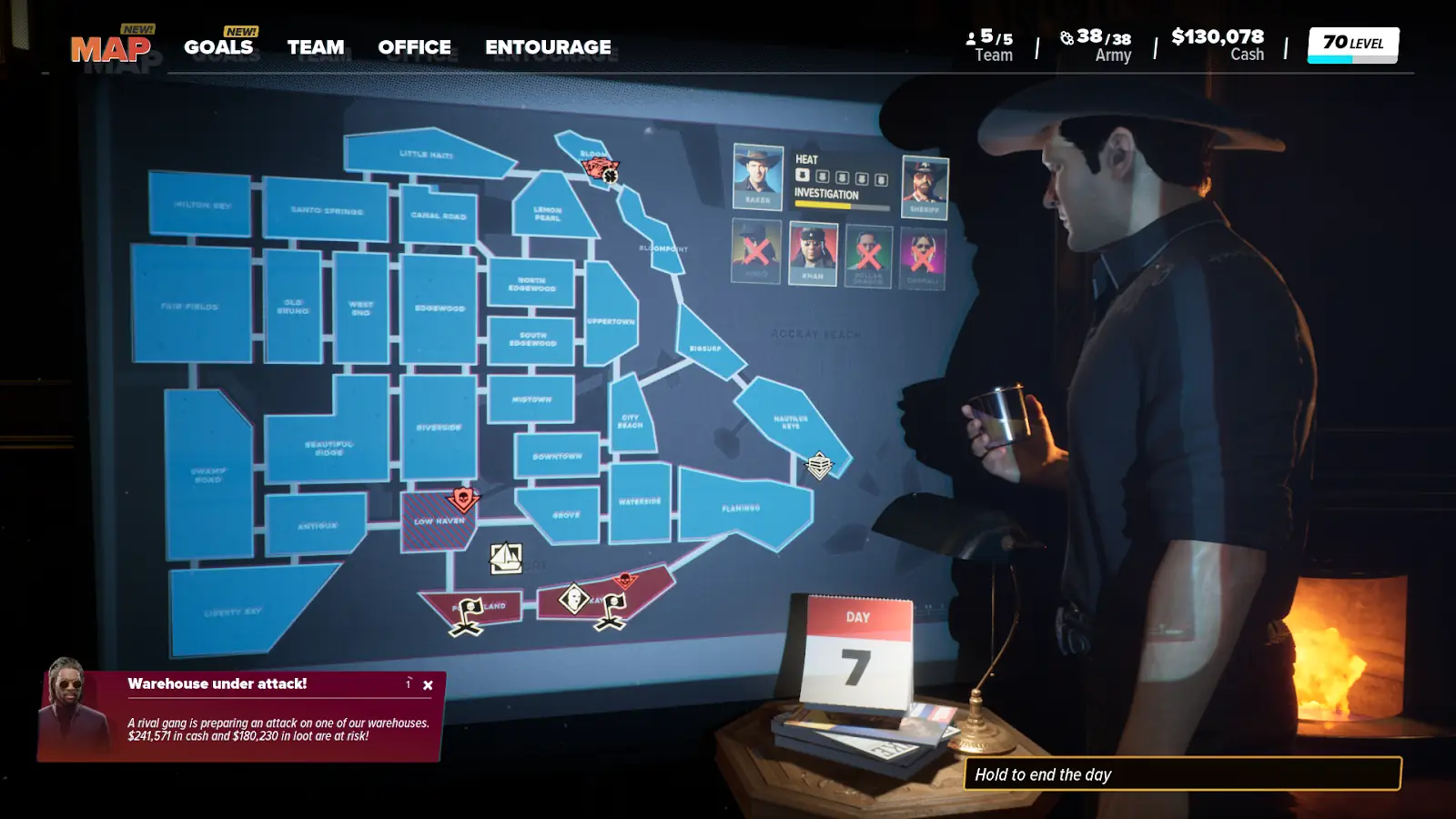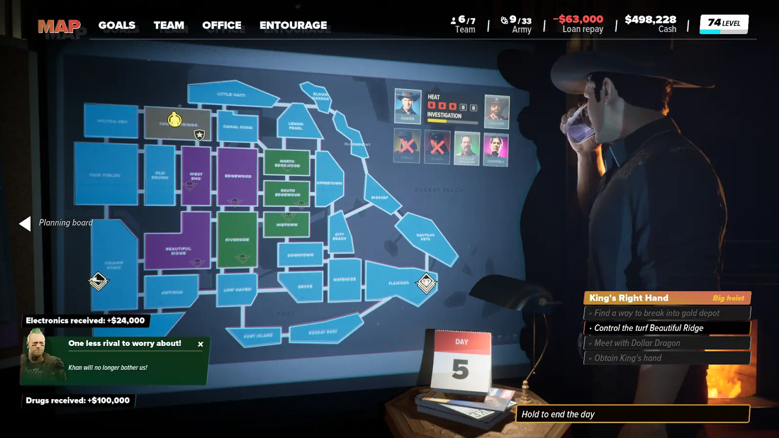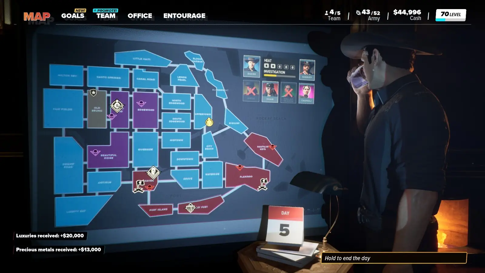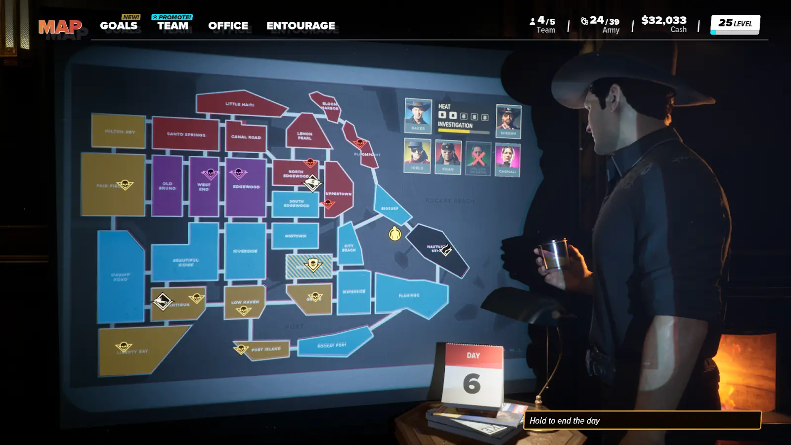 With several upgrades that slowed the investigation under my belt, reducing the police’s speed by 20%, the investigation became irrelevant as well, rarely even reaching half way before I claimed victory even though I was spending every day rampaging across town in the turf war, usually ending each day with max heat.