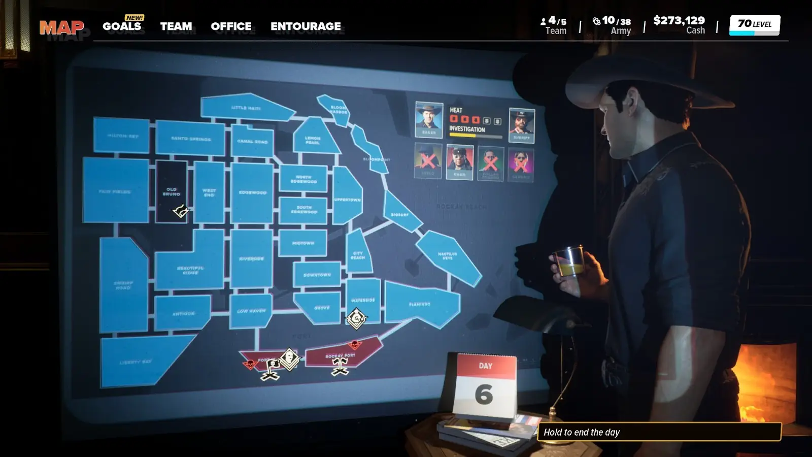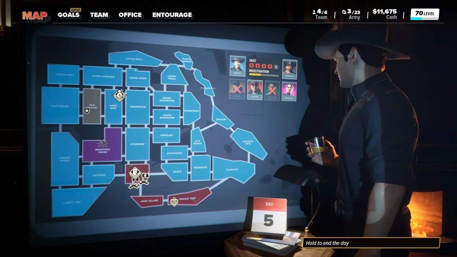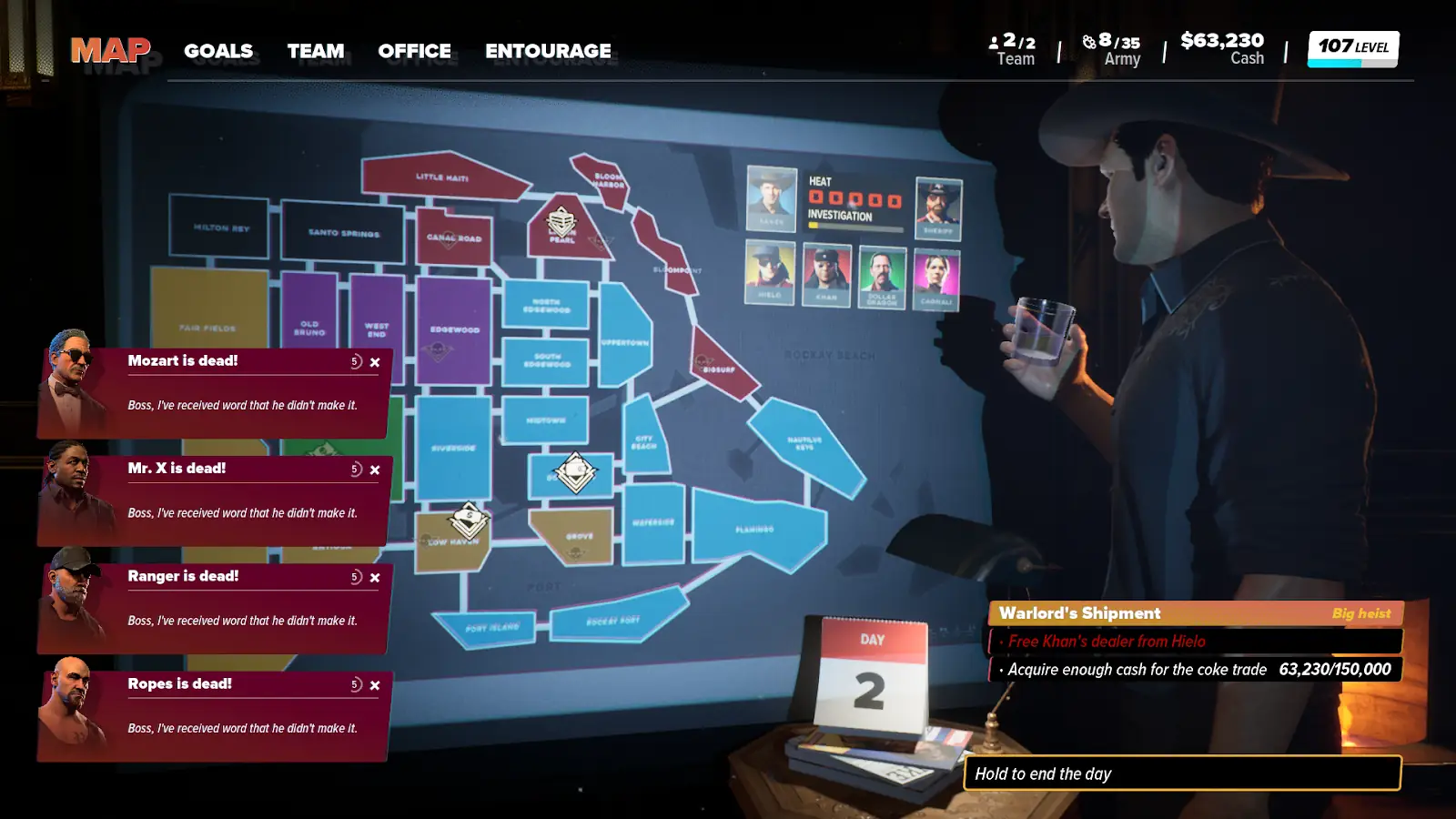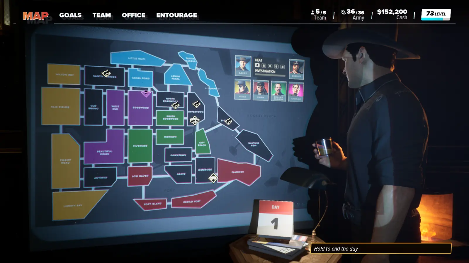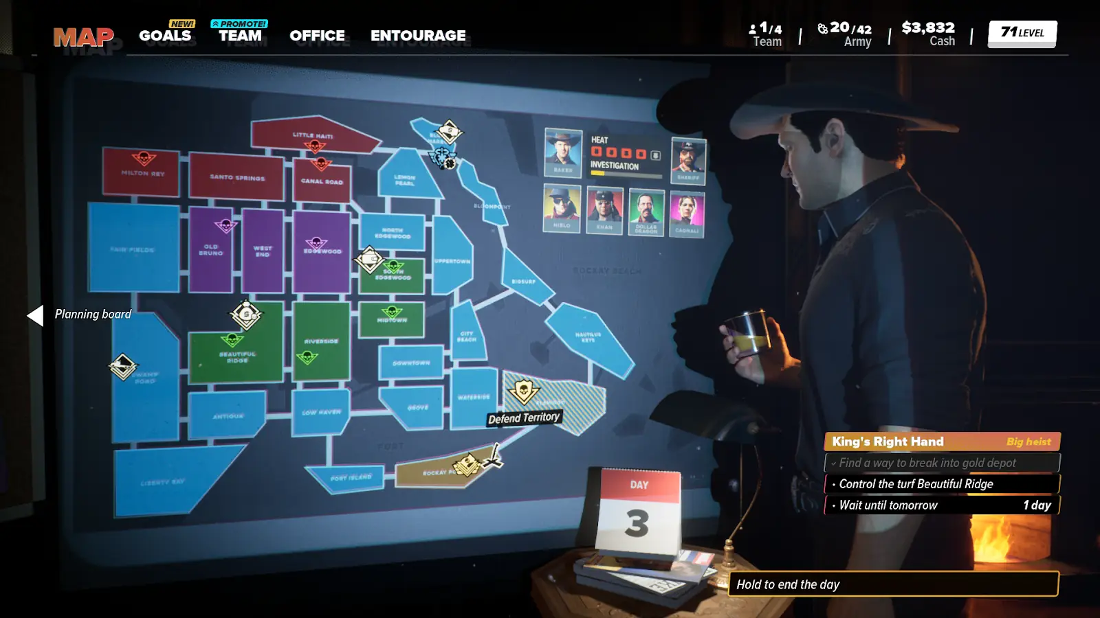 With several upgrades that slowed the investigation under my belt, reducing the police’s speed by 20%, the investigation became irrelevant as well, rarely even reaching half way before I claimed victory even though I was spending every day rampaging across town in the turf war, usually ending each day with max heat.