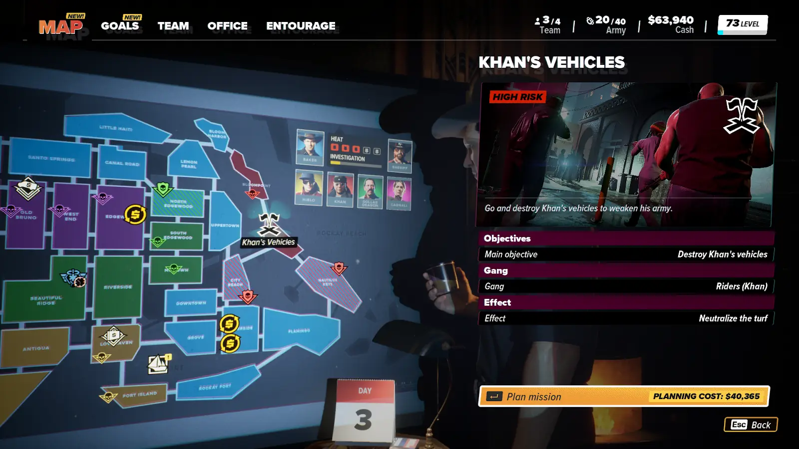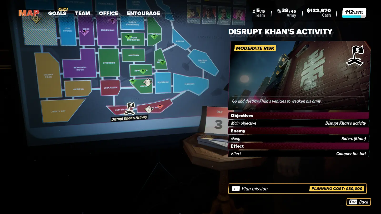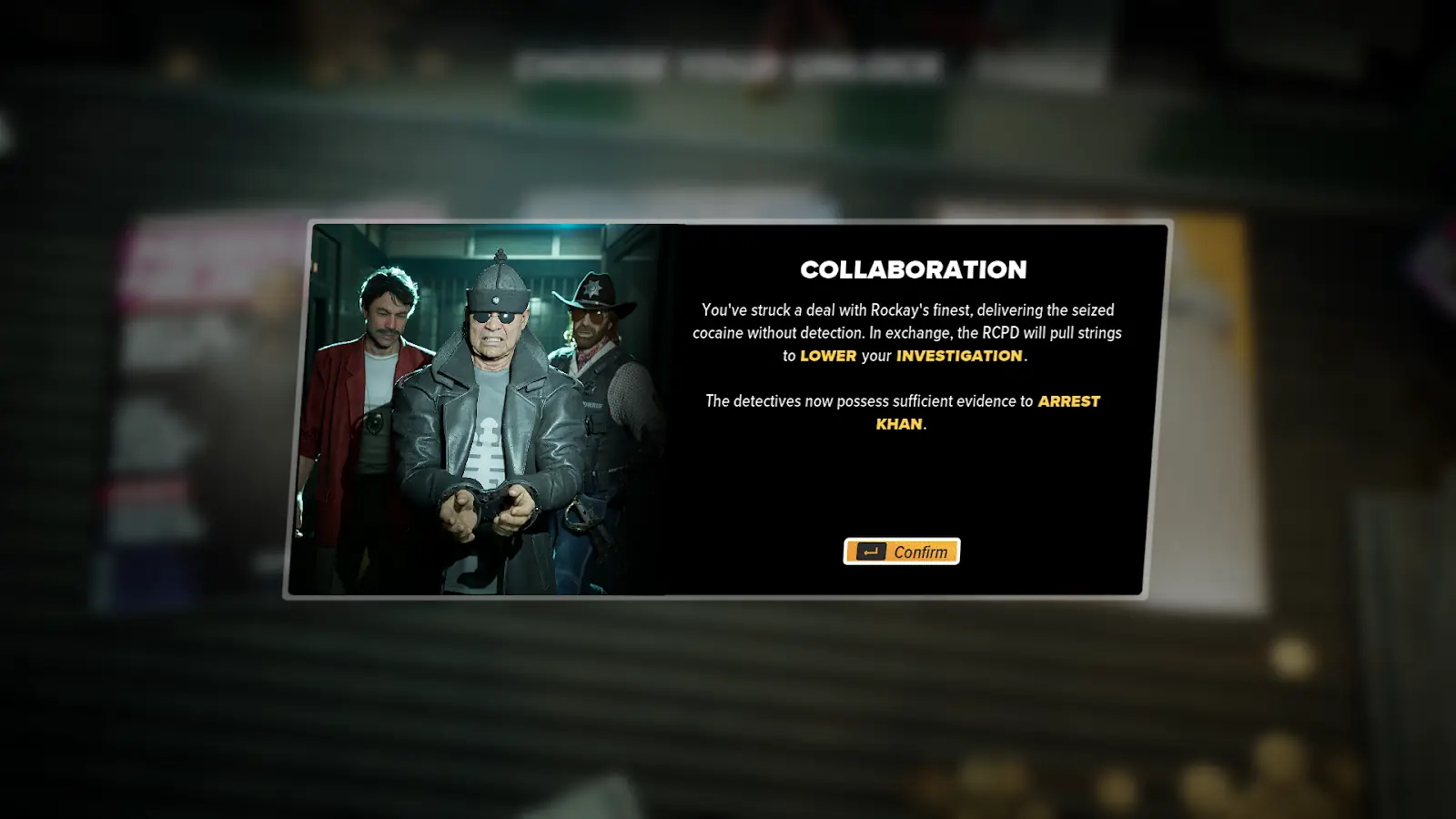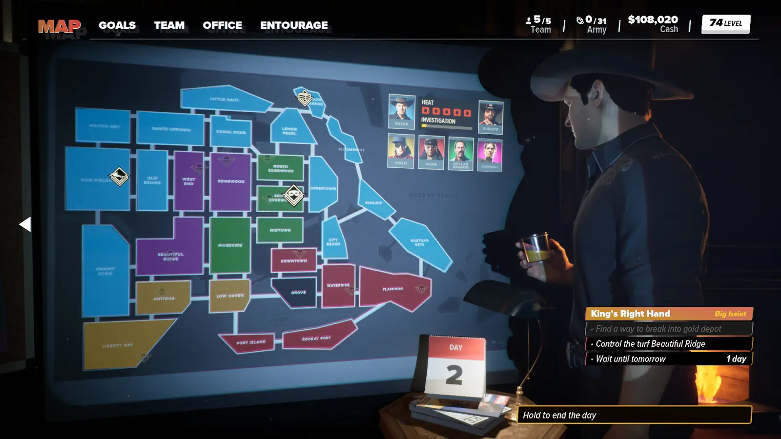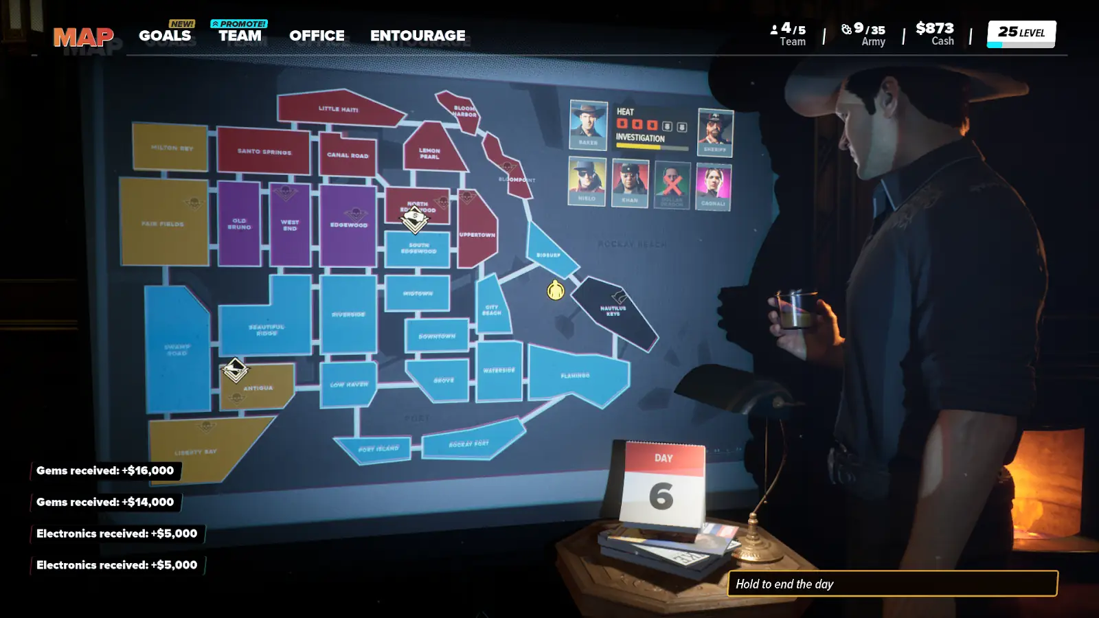 With several upgrades that slowed the investigation under my belt, reducing the police’s speed by 20%, the investigation became irrelevant as well, rarely even reaching half way before I claimed victory even though I was spending every day rampaging across town in the turf war, usually ending each day with max heat.