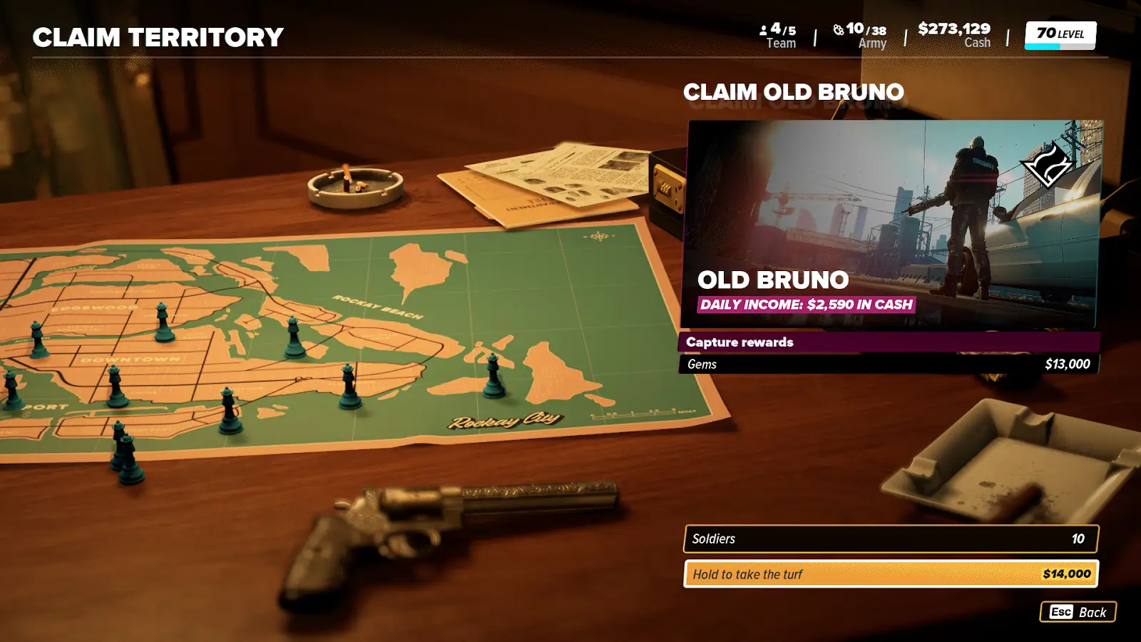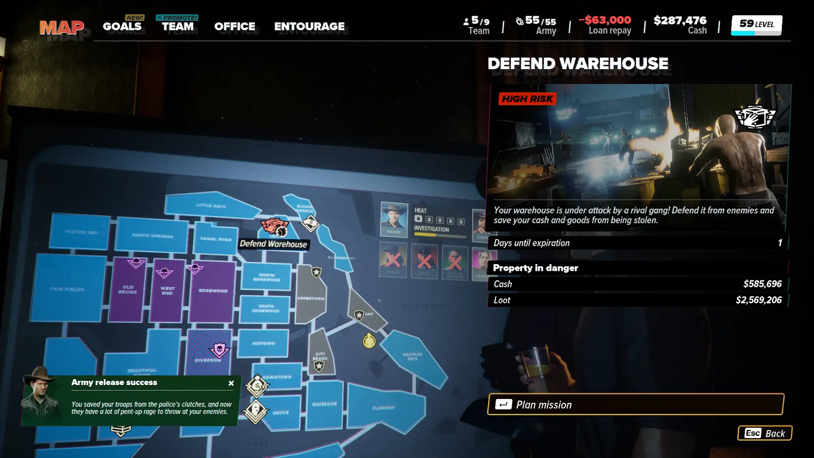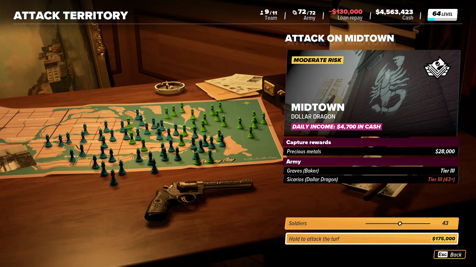 Combine that with the upgrades that gave me extra starting cash and all of the campaign’s hurdles became easy to climb over, the amount of costs I had to pay were massively reduced and for the ones that still existed like planning the big heists, recruiting the troops and upgrading the army I could more than cover the costs, or in the rare instances where I couldn’t I could just take out a loan to keep the momentum going knowing that I would have no trouble paying it back thanks to the rewards from big heists and storming final turfs.
