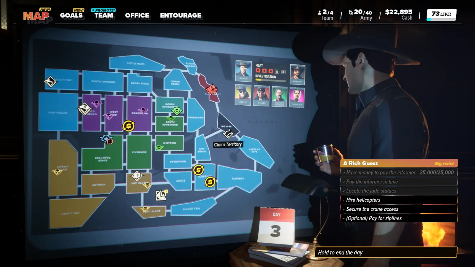 Heists are worth way more than just owning turfs but they come with more risk, your heisting crew is separate from your soldiers, you start with just 3 of them and Baker himself and you can hire more heisters from there, but they’re very expensive, heisters you bring on a job will also take a cut of its profits, which varies from heister to heister.