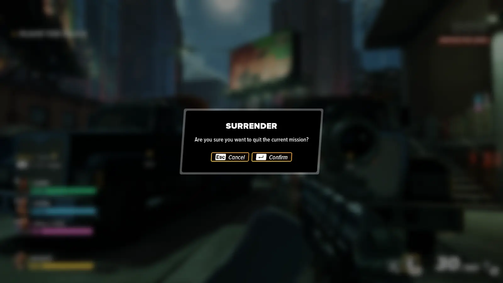 The reason I didn’t know about this is because the game doesn’t tell you about it anywhere and it doesn’t appear in any of the menus, the option to surrender only shows up if you hold alt and f4, in other words you don’t get the restart prompt until you try to crash the game, surrendering is actually in some ways even more generous than restarting by crashing the game, because if you restart through a crash the game will generate a new variant of the heist when you go back in while surrendering allows you to replay the same variant, this means that if you screw up on an otherwise lucky heist variant you can preserve that luck on the next go if you surrender.