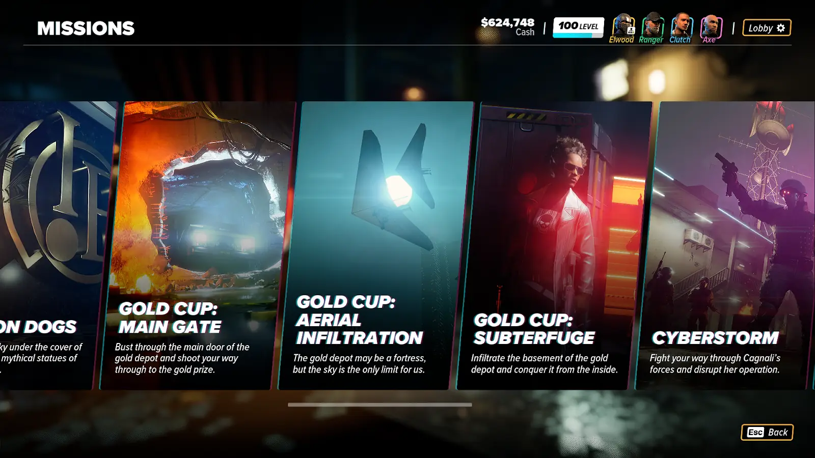 Gold Cup is also a heist that works quite differently from most others in terms of variation, its main variation comes from the fact that you can actually choose from 3 starting points, Main Gate, Subterfuge (which starts you in the basement) and Aerial Infiltration (which starts you on the roof), with Main Gate being a loud-only approach and the other 2 allowing for stealth, I always played Aerial Infiltration because it’s the only 1 of the 3 starts that allows you to get a keycard for the control room right at the start, and with the security room and the office where you can find the whiteboard for it both being on the top 2 floors starting from the roof rather than the basement also just makes the whole thing faster.