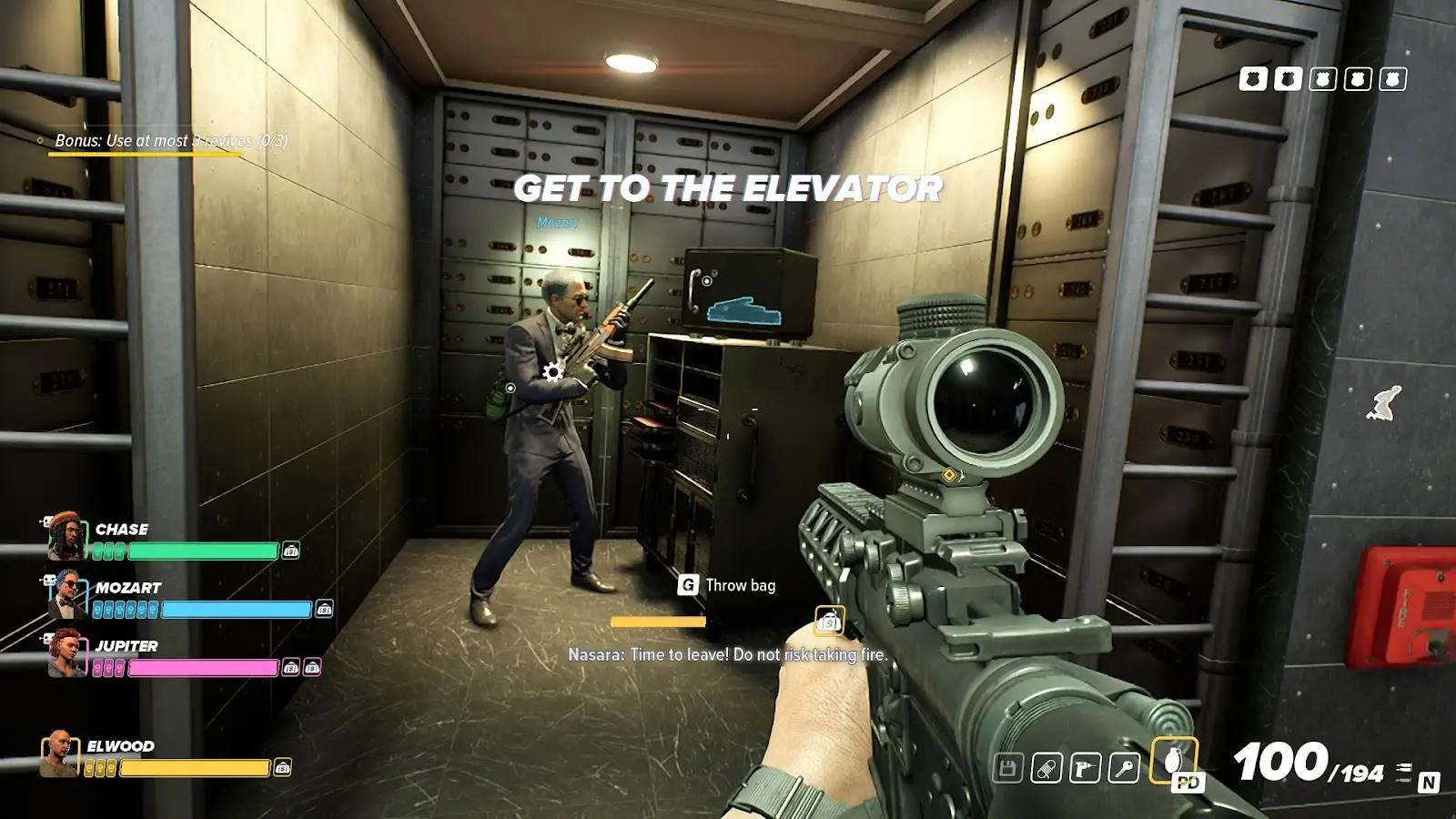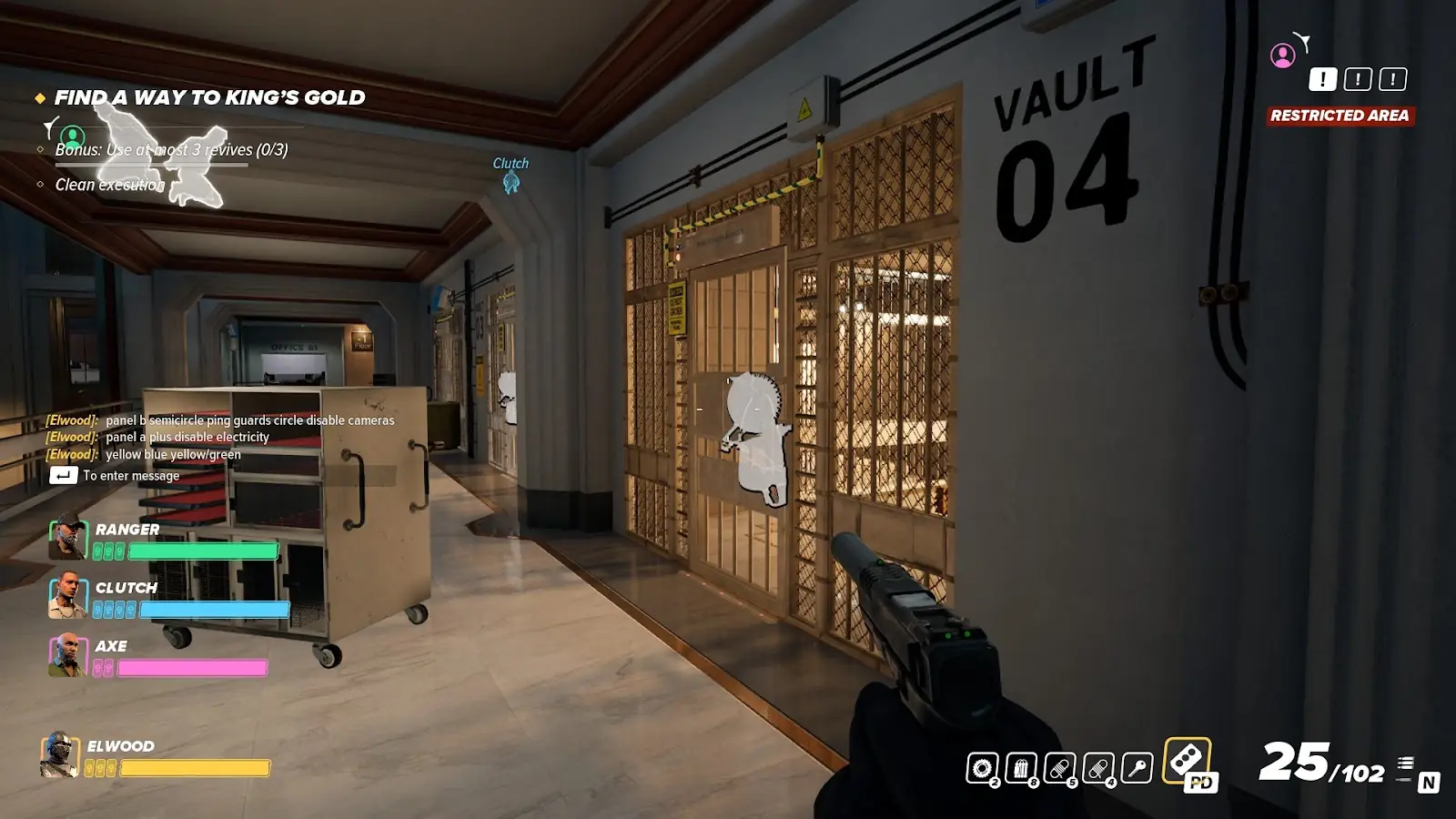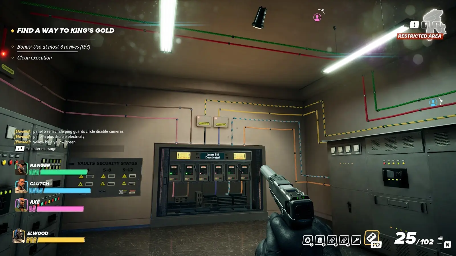 Beyond that the heist has very little variation at all, a few guard placements can be switched around, it varies on which cages hold the gold and whether you have 1 saw to use or 2 (in Baker’s Battle you can buy the extra saw while setting up the heist the buttons you need to press on the building’s control room to disable the security change each time (you can always check what they are on a whiteboard on the floor below it), the colours of the wires you need to cut to turn off the lasers on the cages do too (the wire colour appears above the cage), since Multiplayer has no heist setup the game just rolls the dice), other than that there are no surprises, the objectives always work the same way and there are no curveballs.