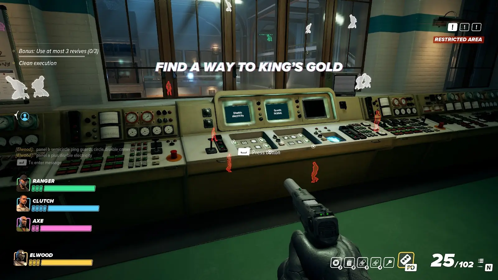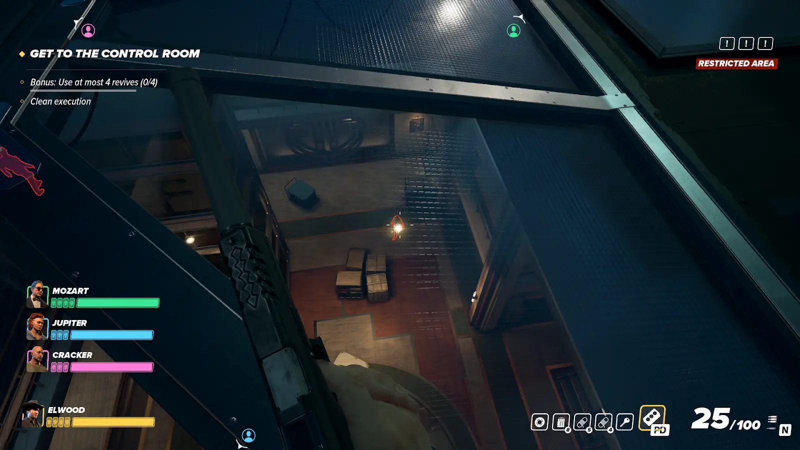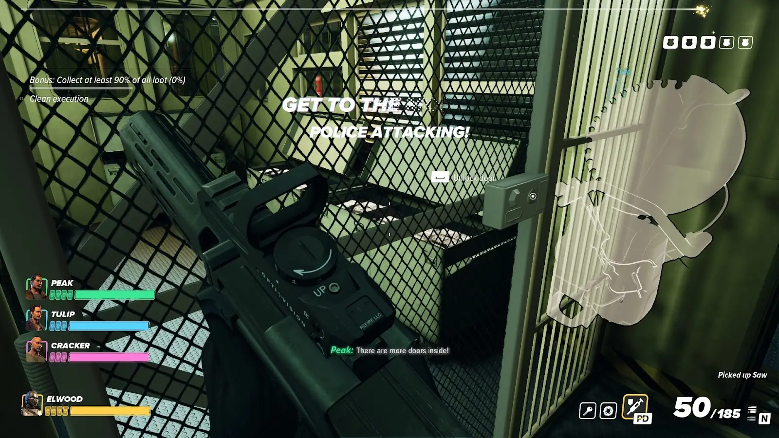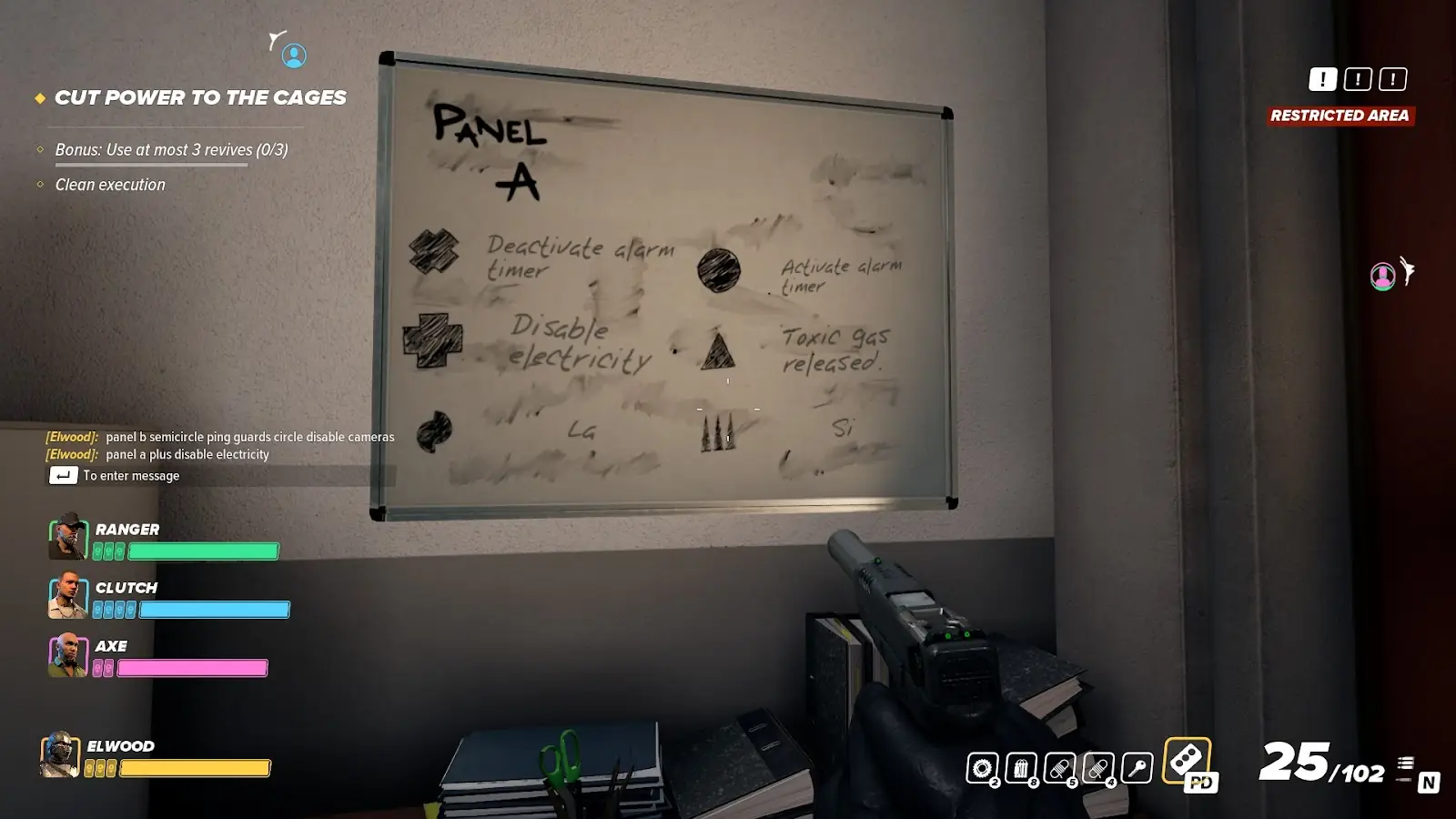 Beyond that the heist has very little variation at all, a few guard placements can be switched around, it varies on which cages hold the gold and whether you have 1 saw to use or 2 (in Baker’s Battle you can buy the extra saw while setting up the heist the buttons you need to press on the building’s control room to disable the security change each time (you can always check what they are on a whiteboard on the floor below it), the colours of the wires you need to cut to turn off the lasers on the cages do too (the wire colour appears above the cage), since Multiplayer has no heist setup the game just rolls the dice), other than that there are no surprises, the objectives always work the same way and there are no curveballs.