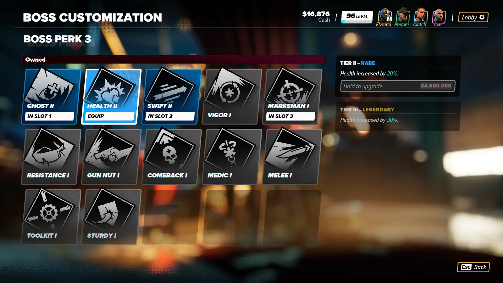 Running this heist time and time again massively sped up the progress, although it was still sluggish, instead of a whole day of on and off play to unlock a character it only took a few hours, after that I bought up all the perks and started levelling up their tiers, starting with Ghost, which decreases enemy detection speed, and Swift, which increases player speed, which made the subsequent Gold Cup runs even easier, then I got Health, because it was one of the only ones I could afford.