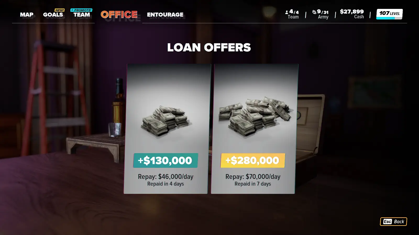 If you’re desperate you can also take on loans, which give you a lump sum of cash in exchange for forcing you to pay a certain amount back per day, be careful with this because taking on a loan you can’t afford, or making certain payments you can’t afford if the game allows you to, will put your funds in the minus numbers, if you don’t resolve that crisis within a few days you go bankrupt and soldiers will start leaving, no one likes to take on a job if they’re not on the payroll, especially if that job is murder.