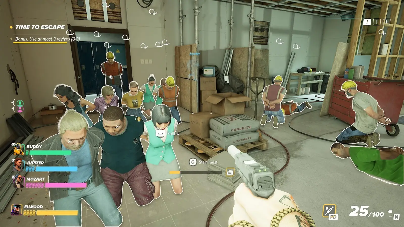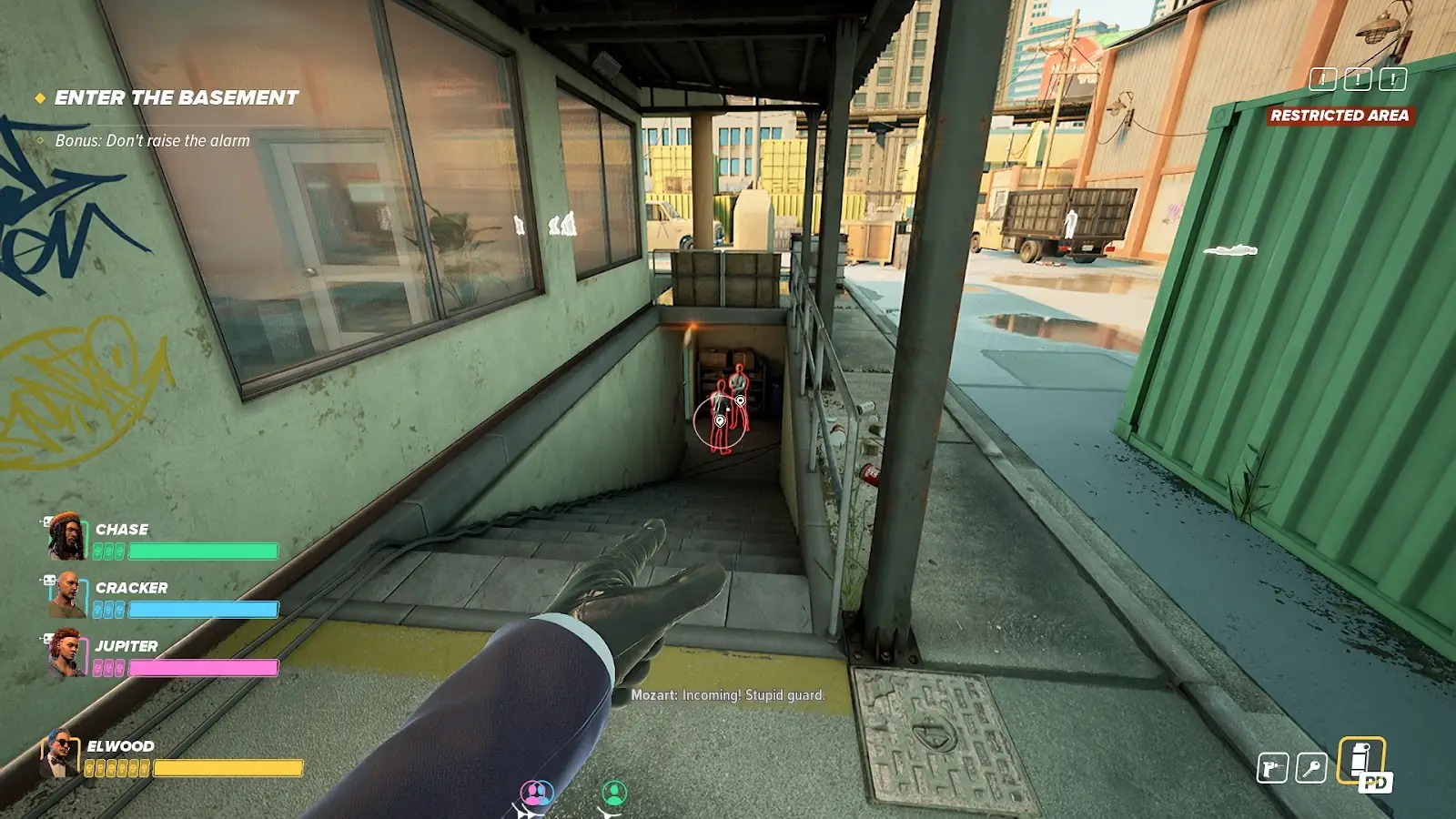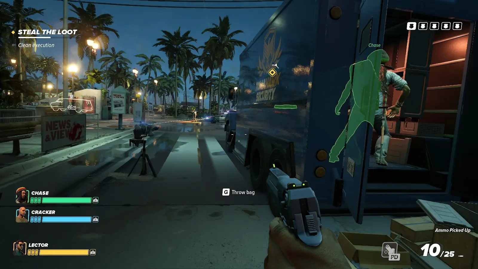 In Crime Boss the AI will still hang back by default in stealth but you can order them to come with you, if you bring them to the loot they’ll bag it up for you, if you toss a bag on the ground they’ll go and grab it and deliver it, if there’s a lock in the way they’ll pick it,
