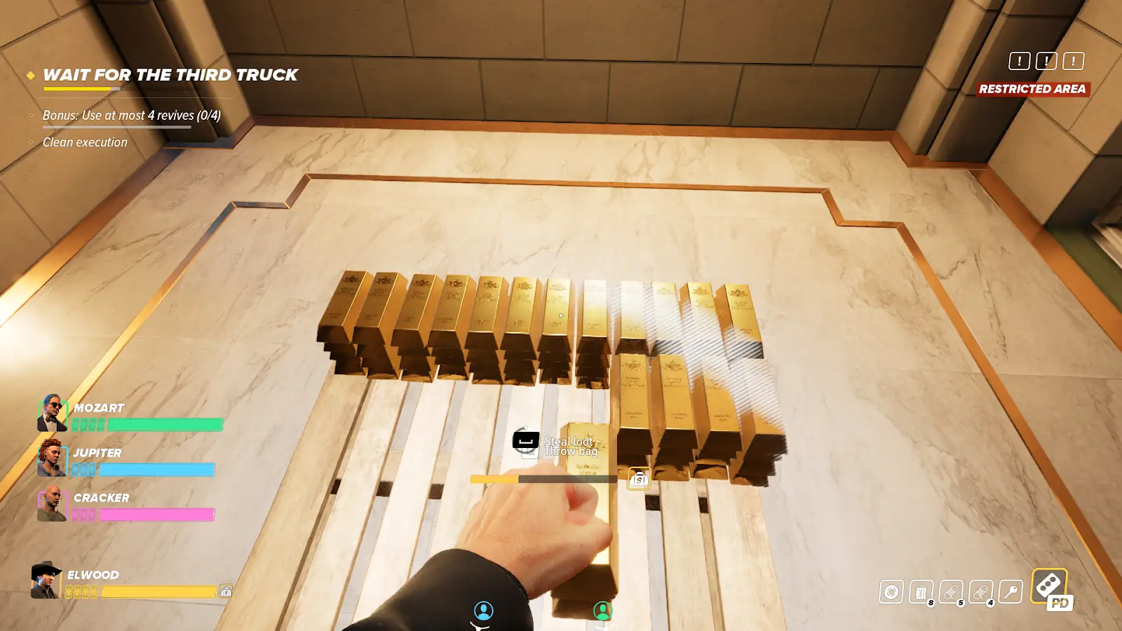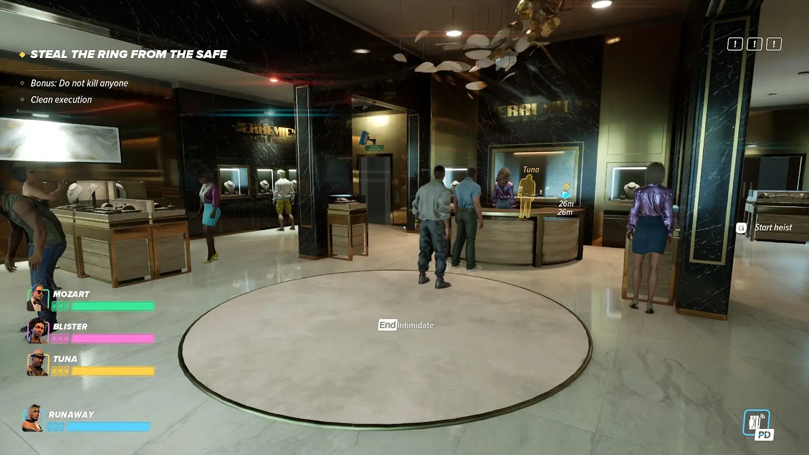 Many heists also include a “start heist” button which appears during stealth, holding it will prompt the AI to draw their weapons, move out from their passive starting positions, subdue everyone they find, and start bagging the loot if you’ve already found it.