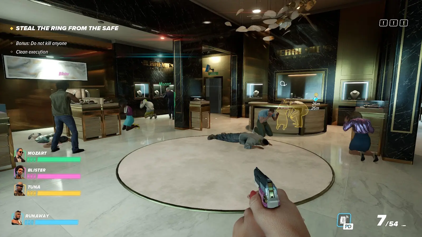 Mall robbery, in one session I got this job twice in a row, but the first time it was a night variant where only 1 shop had any civilians, a group having a dance party, so I just avoided that one and pilfered the rest, which were all empty, we also started on the rooftop with a path straight to the security room, the second time it was a day variant starting on ground level.