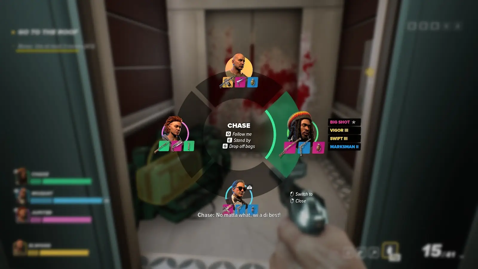 On top of all that, you (as the player in singleplayer or the host in multiplayer) can actually use this menu to switch between playing as your main character and the bots on the fly, letting you take advantage of all of their different perks and bits of equipment, this comes with all sorts of advantages: If your current character gets knocked down you can switch to someone else and revive them rather than crossing your fingers and hoping the AI will do it for you, if a civilian is trying to run away you can switch to the character closest to them and catch up.