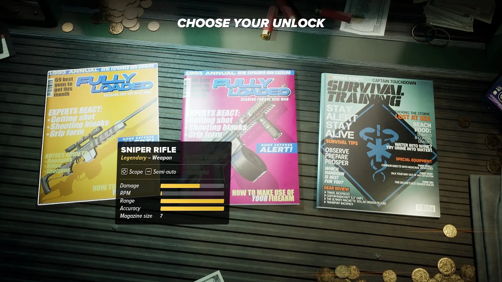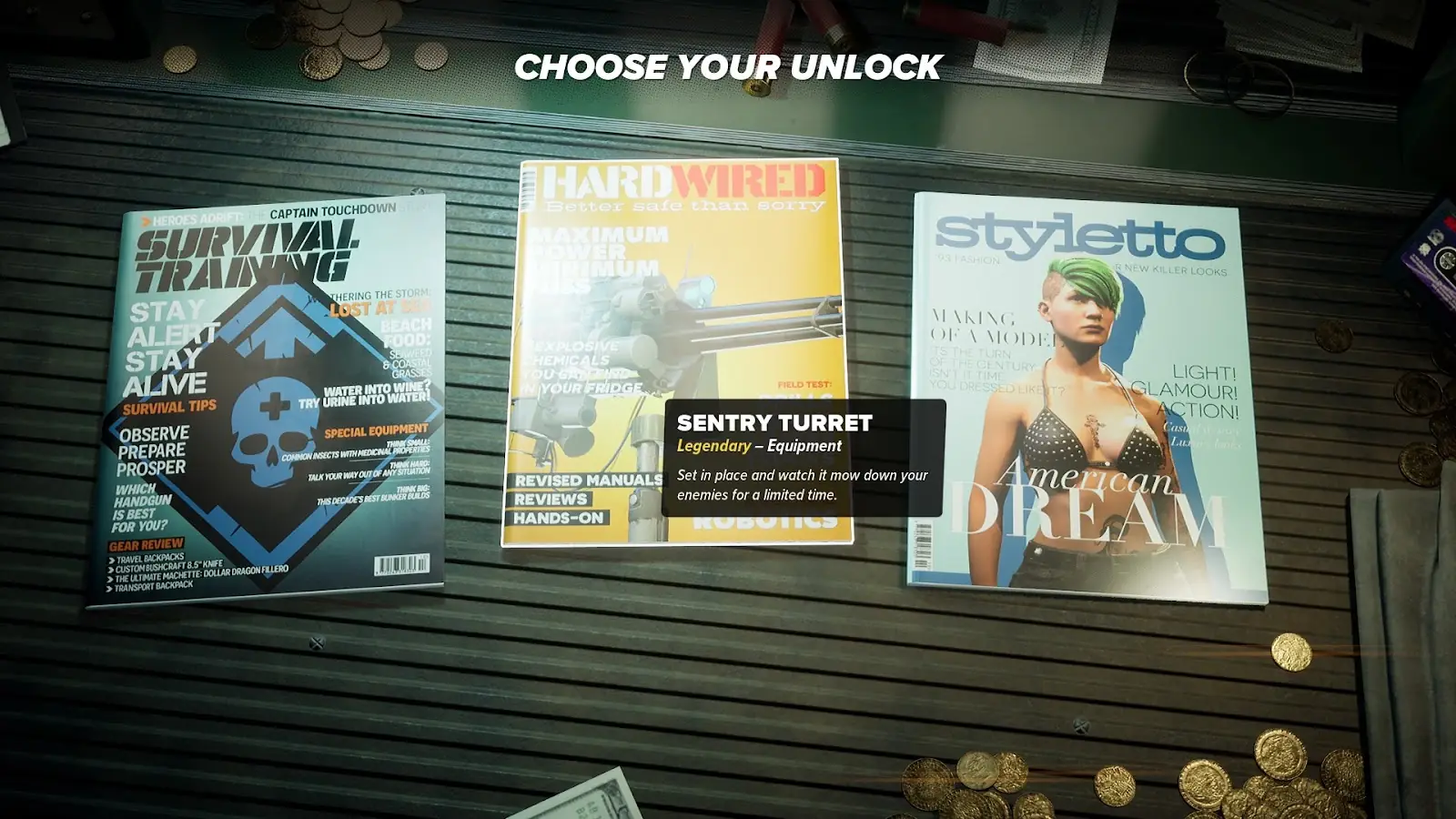 Not all of these unlocks are available at the start, each time you level up you get the option to pick from 3 possible unlocks, it might be a new weapon, a bit of equipment, a new perk, a new boss skin or a weapon skin and once you have it you can then go and buy it.