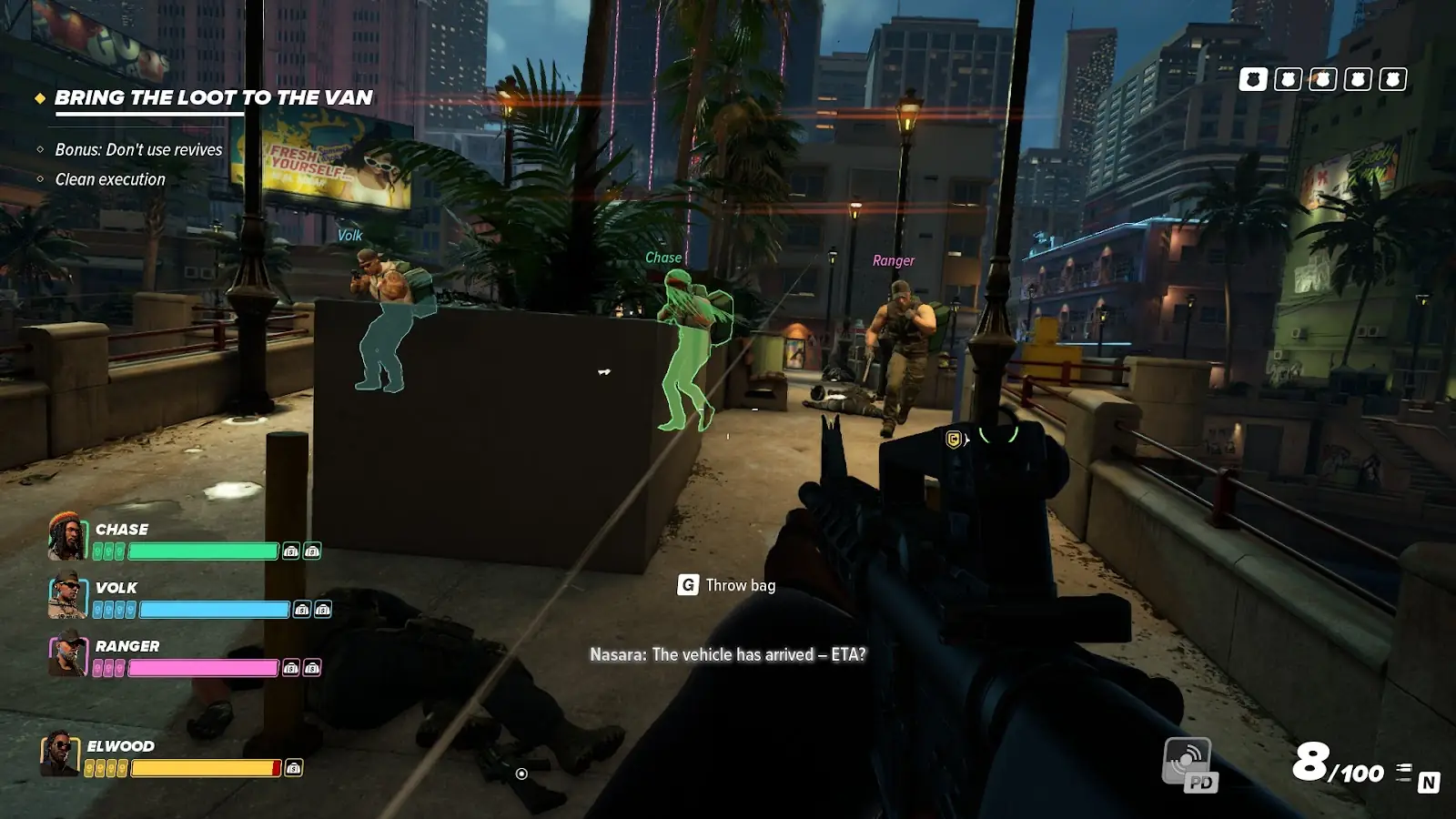 There’s also a quick command wheel where you can order either all of your bots or one specific bot to follow you, hold position, or deliver whatever loot they happen to be carrying to the dropoff point.