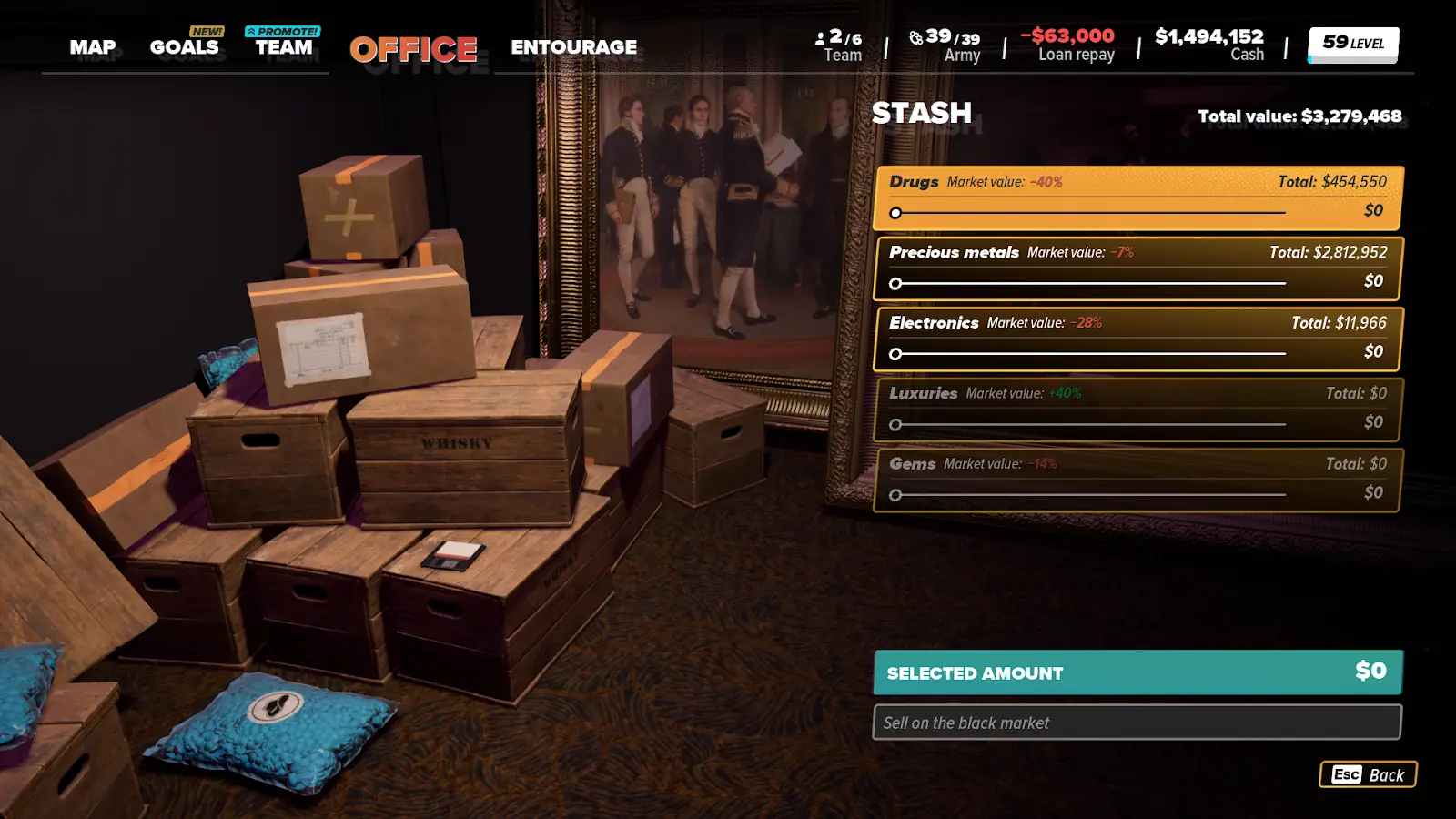 As well as raw cash a share of the heist is also paid out as loot, which can be sold in whatever quantity you choose on a market, where prices fluctuate each day, and sometimes used to pay for certain costs instead of money.