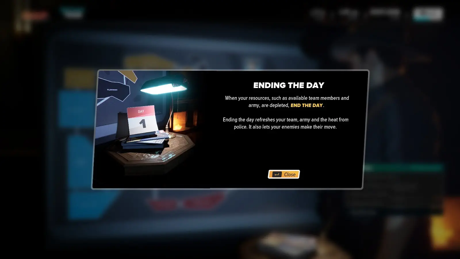 The day is essentially your turn, you can do as much with that day as you have the resources for: Take turfs, do heists, sell loot, recruit troops, buy, upgrade and kit out heisters and so on, and you can end the day whenever you like, but once you do the other factions get their turns, and so do the cops.
