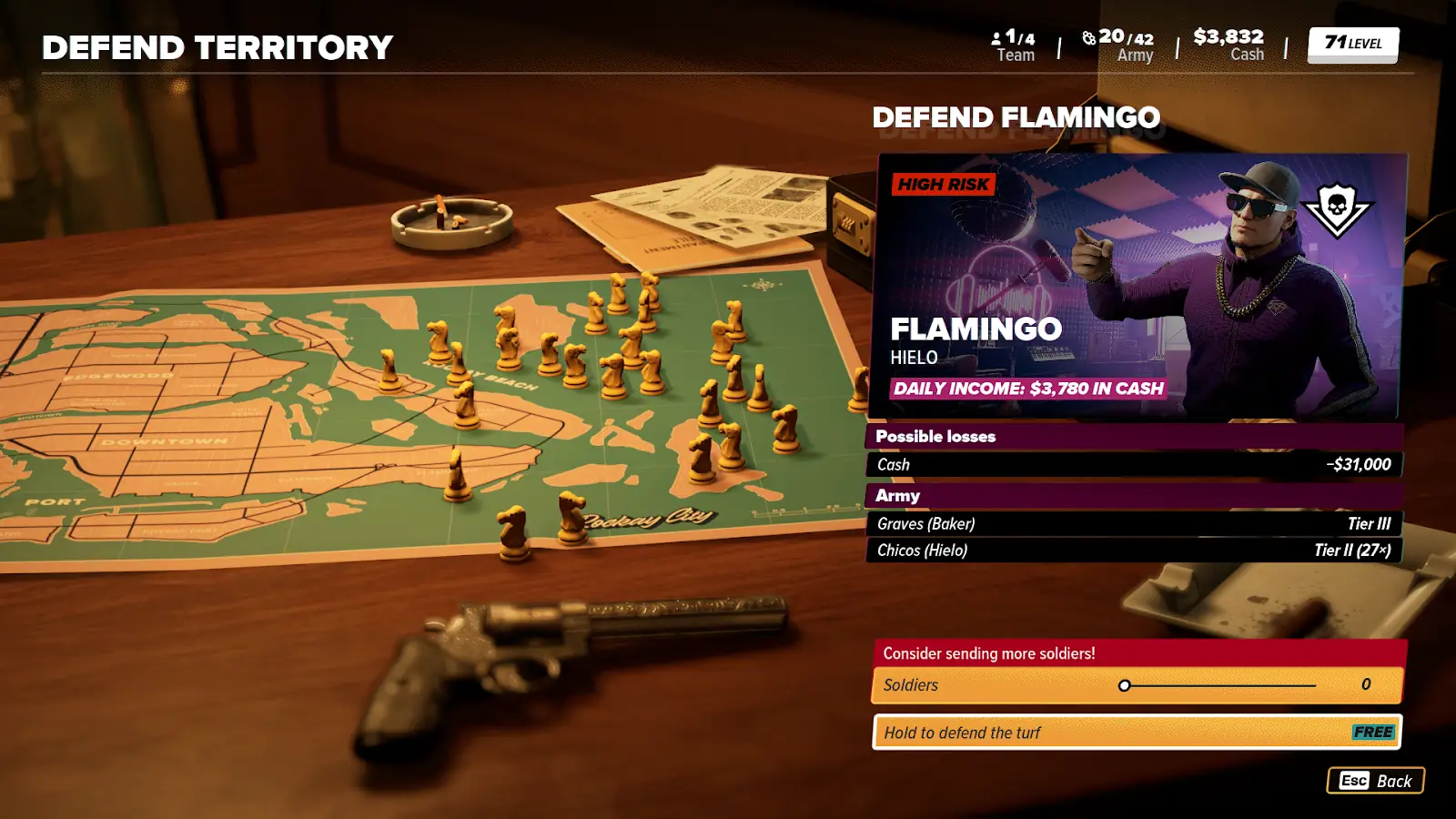 Having extra starting turfs allowed me to go on a rapid Blitzkrieg rapidly expanding Baker’s empire, the quicker you expand the sooner you get the option to upgrade your army tier and the quicker you destroy the factions the quicker you get the rewards for conquering their final turf, this strategy also meant that I almost never had to do defence missions, I was able to repeatedly opt for defence through offence instead.