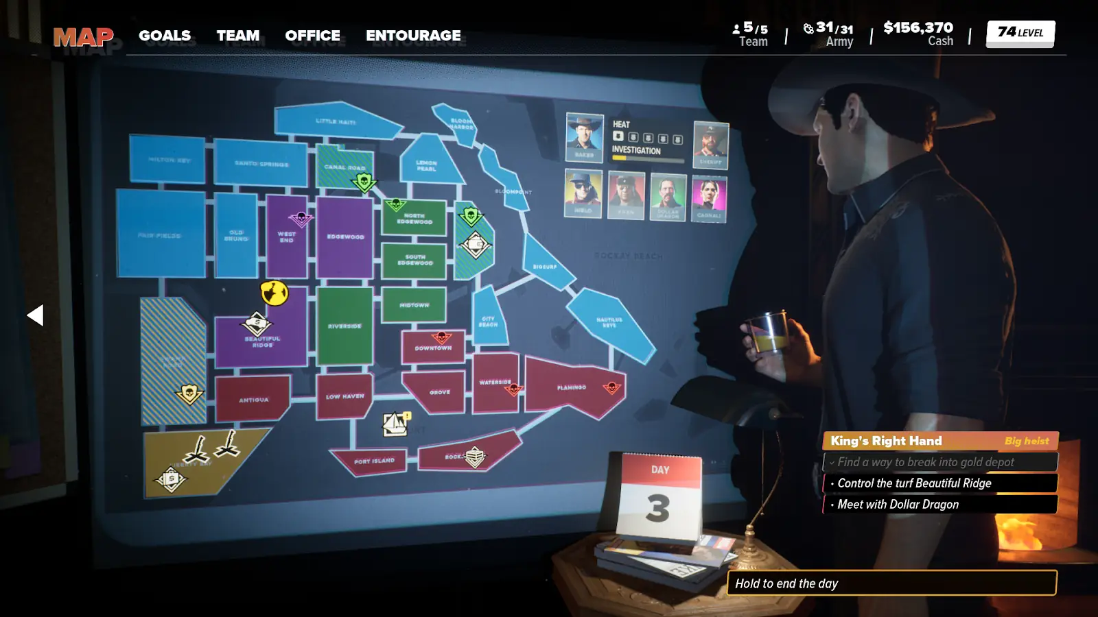 Day 2 is also where the game would introduce the first Big Heist of the run and give me the first prep jobs for it, dangling that prospect of millions in cash and/or a campaign altering choice over my head, and before I knew it I was several days into the campaign, robbing bank vaults, gold depositories and yachts and channelling the funds into the shooting and strategy of turf war. It was hard to break the cycle and either hold myself back from starting a new run or genuinely stop at the first day or two.