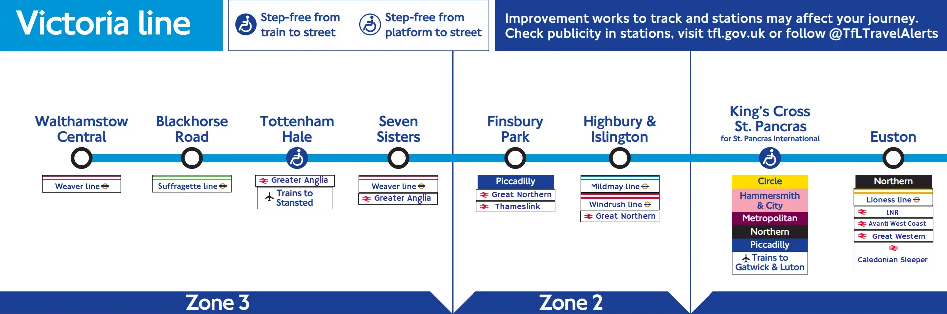 - Weaver line to Seven Sisters (8 stops), Victoria Line to Finsbury Park (2 stops), Piccadilly Line to Wood Green (3 stops)