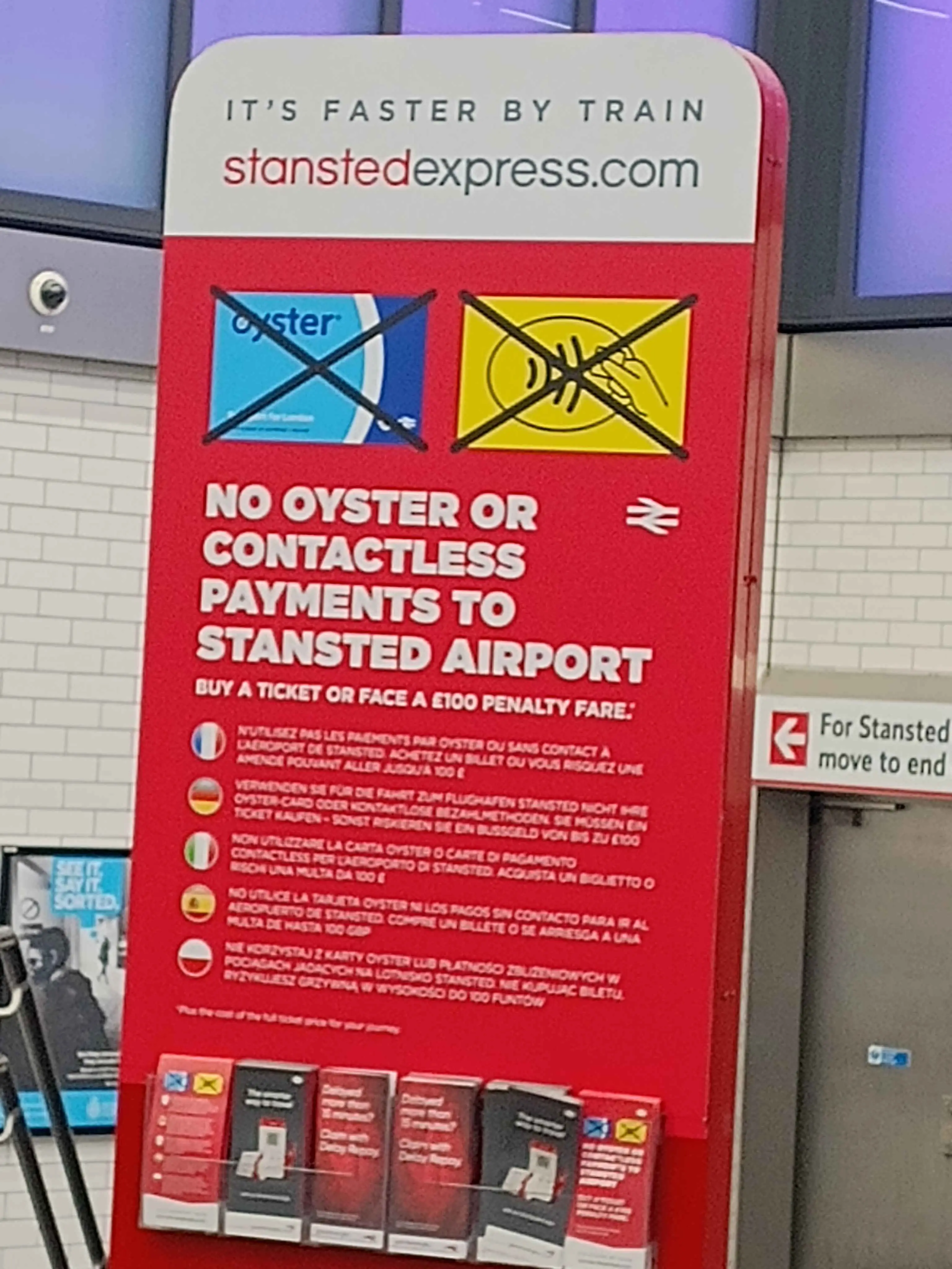 To try and combat this problem Greater Anglia have posted a bunch of warning signs at these gatelines but they’re very badly worded, the most common ones simply warns you that you have to pay a £100 penalty fare if you travel to/from Stansted Airport without a ticket, which is true since the Airport doesn’t take contactless, but it doesn’t tell you anything about the other stations in-between.