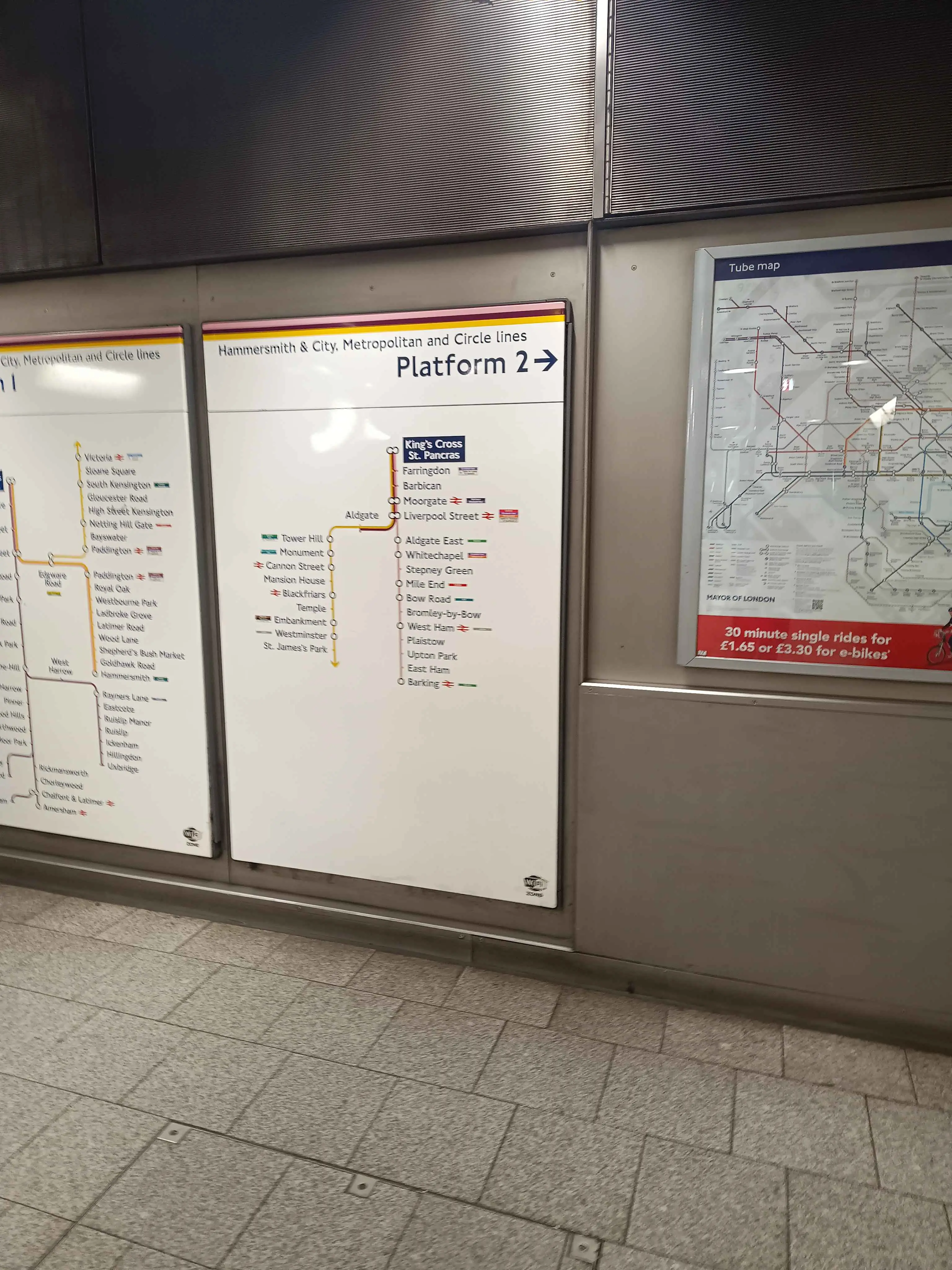 You don’t even have to take a train to go between Liverpool Street and Moorgate since they’re linked by a tunnel connection running along the Elizabeth Line underground platforms, but if you wanted to you could take the Metropolitan Line, Circle or H&C, it’s 1 stop.
