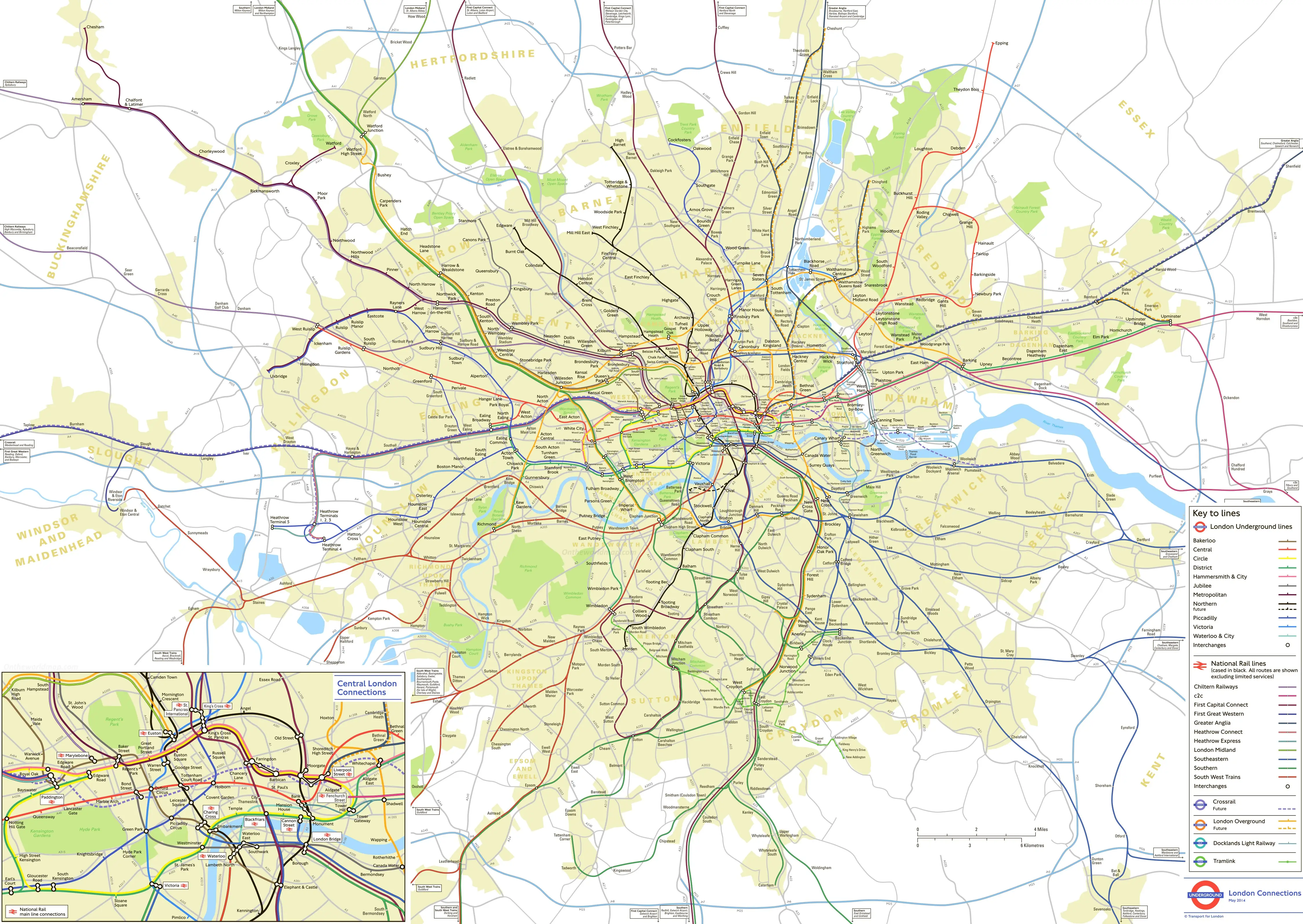 It’s just over a decade old so some things are a bit out of date, several finished services (Overground extensions, Crossrail and a Northern line extension) are marked as future plans, Crossrail hasn’t been named Elizabeth Line yet, several lines have their old TOC names (LNR is “London Midland”, Thameslink and Great Northern are “First Capital Connect”, GWR is “First Great Western” and SWR is “South West Trains”) but here we can see the geography of where these lines really are.