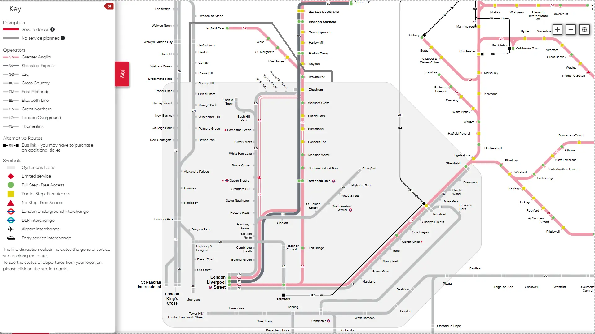 See - GTR route map, Chiltern route map, C2C route map, LNR route map, SWR route map, SE route map] ↩︎