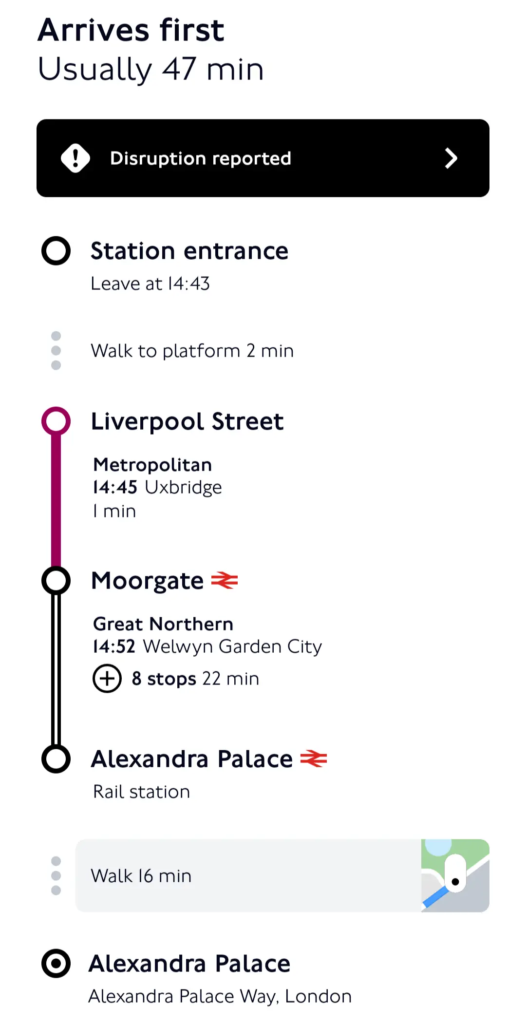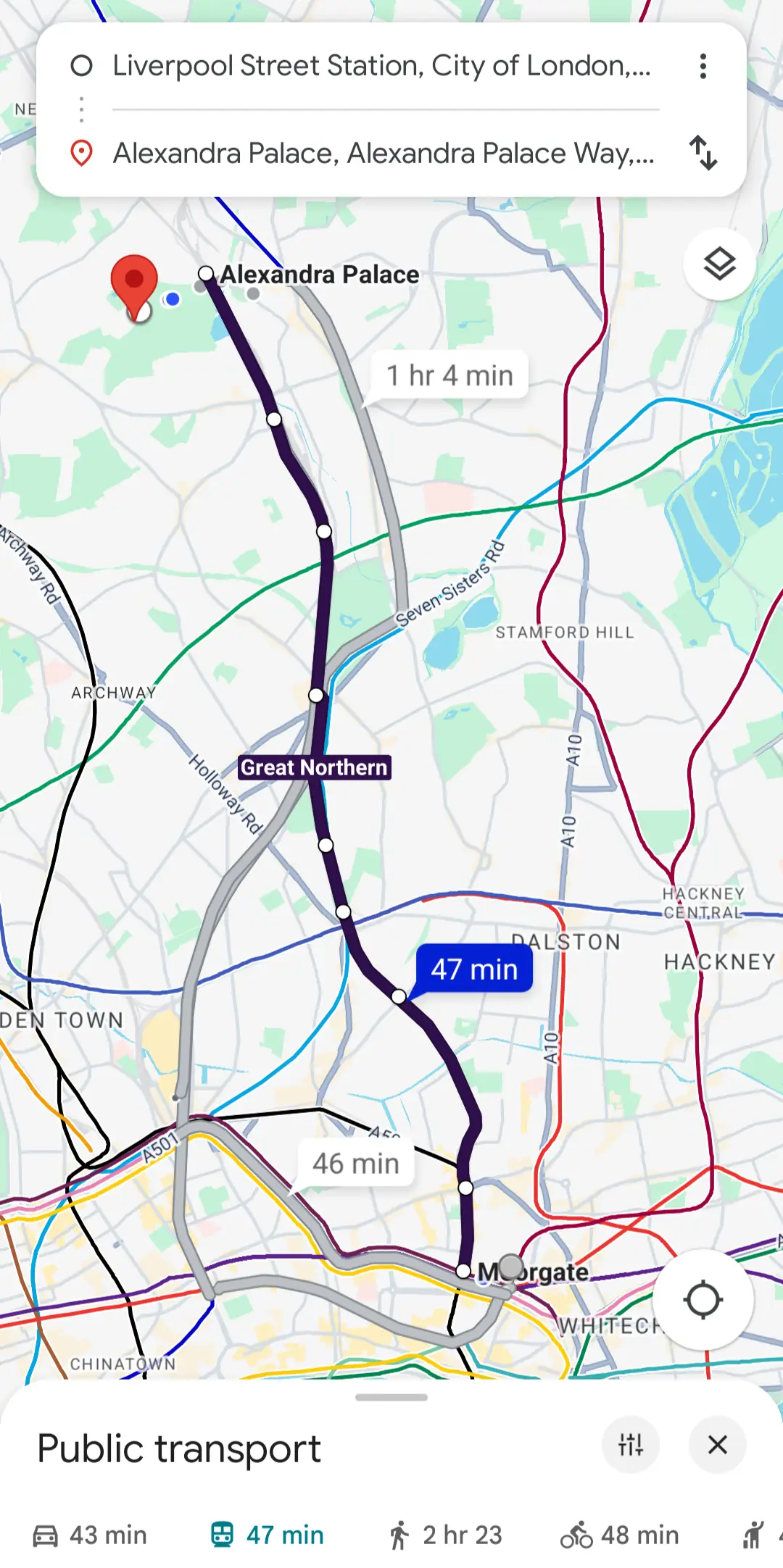 Here’s another example, let’s start from Liverpool Street again. a few months ago I went to a gig in the huge Alexandra Palace venue, , the closest station to it on the Tube map is Wood Green on the Piccadilly Line, 20 minutes away according to TfL Go, half an hour according to Google Maps.